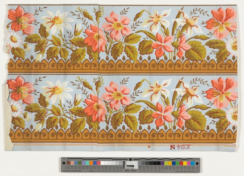 Fragment of floral wallpaper border with trimmed edge. Naturalistic pink flowers and buds on green leafy branches or grasses. Flocked red background is overprinted with black to emulate shadow. Block-printed in two greens, two browns, yellow, two pinks, mauve, red, black and red flocking on olive g...