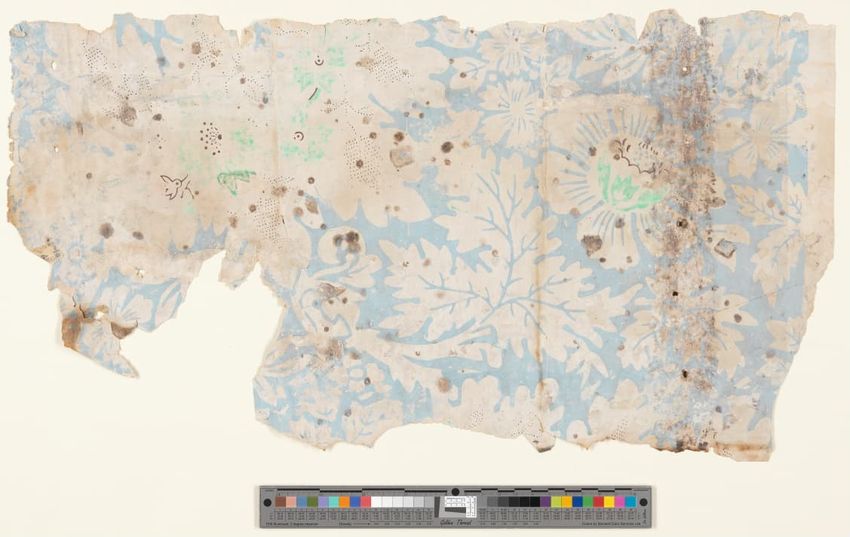 Unused wallpaper fragment. Bouquet and sprig pattern. Large bouquets of pink and white apple blossoms alternate with small sprigs of violet flowers. Block-printed in twenty-four colors: yellow, white, three olives, four greens, red, two pinks, three mauves, three browns, blue, aqua, four violets ...