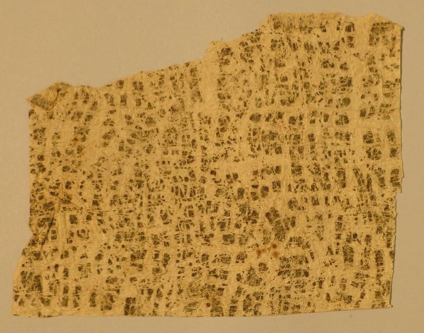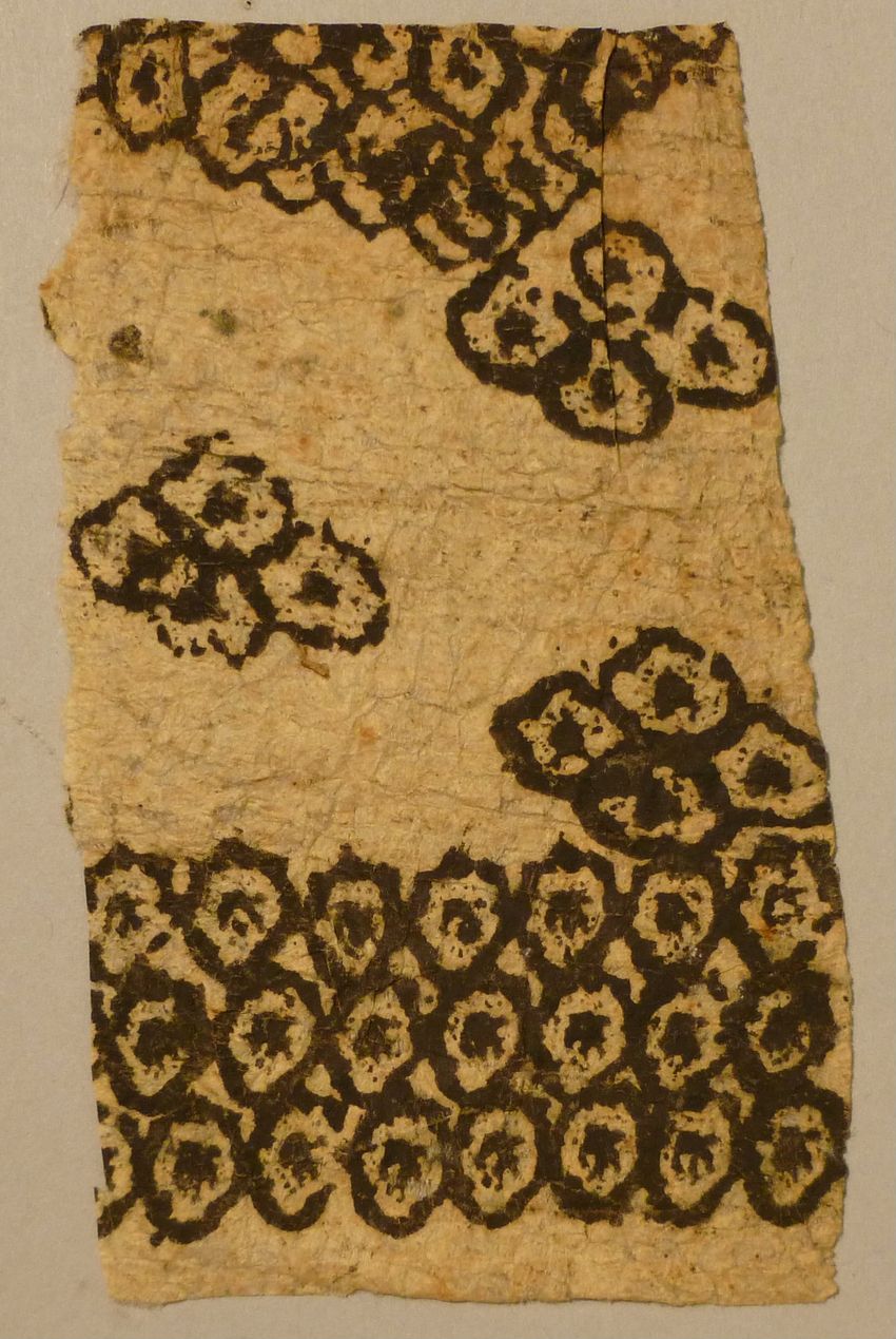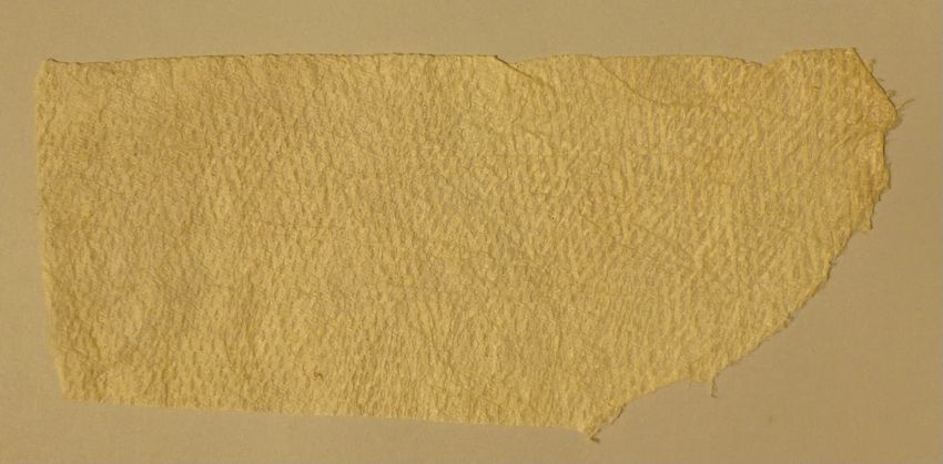 Kapa fragment, white with embossed criss-crossing lines that create translucent diamond shapes. Kapa is the Hawaiian term for tapa, a cloth made from the inner bark of certain trees and widely used in the Pacific for clothing and bedding, as well as other secular, sacred, and ceremonial uses.