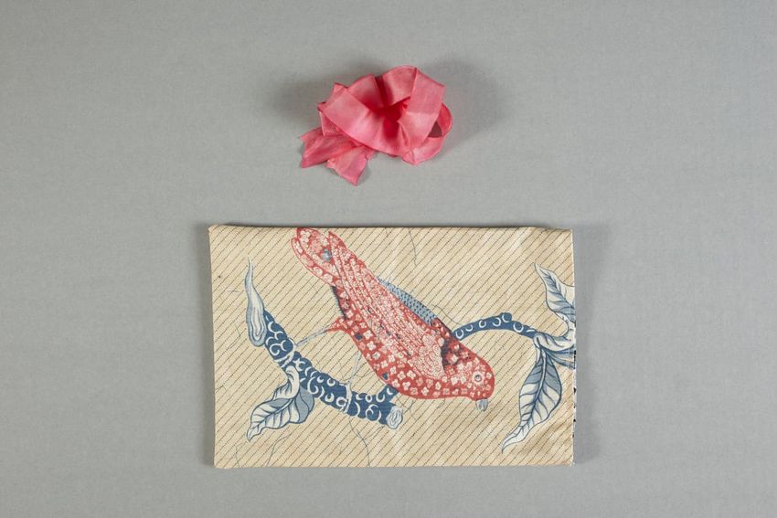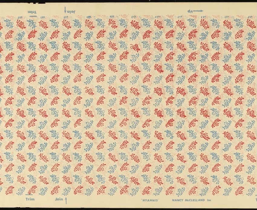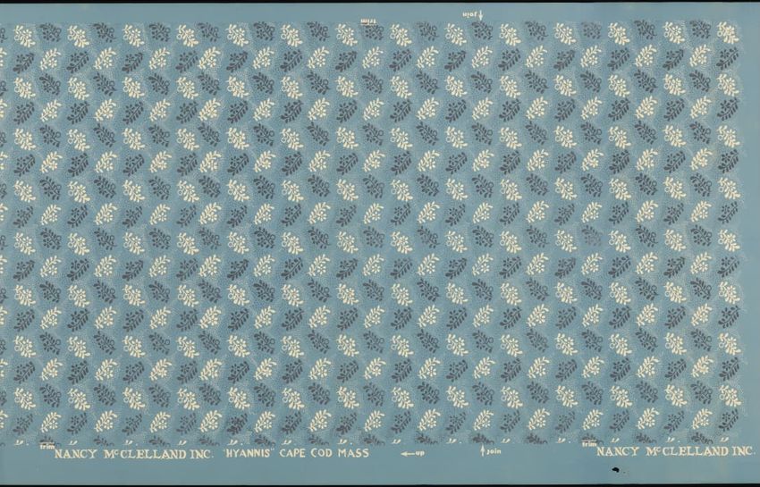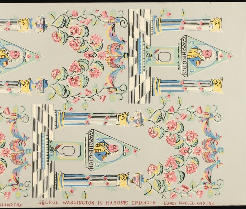Roll of wallpaper depicting George Washington, columns, and flowering urns, pink, white, green, black on pale gray ground.
