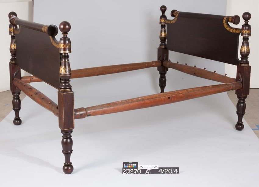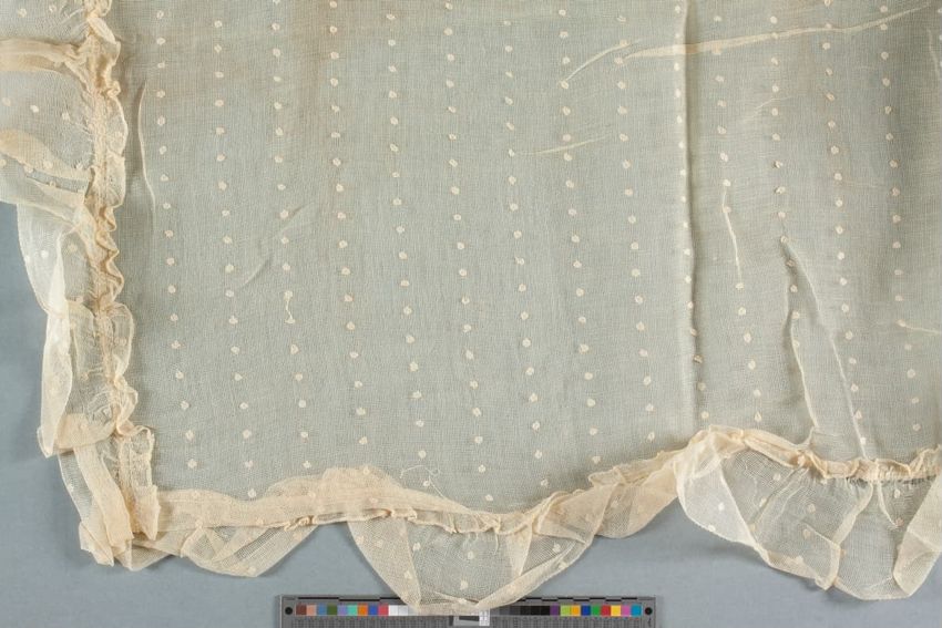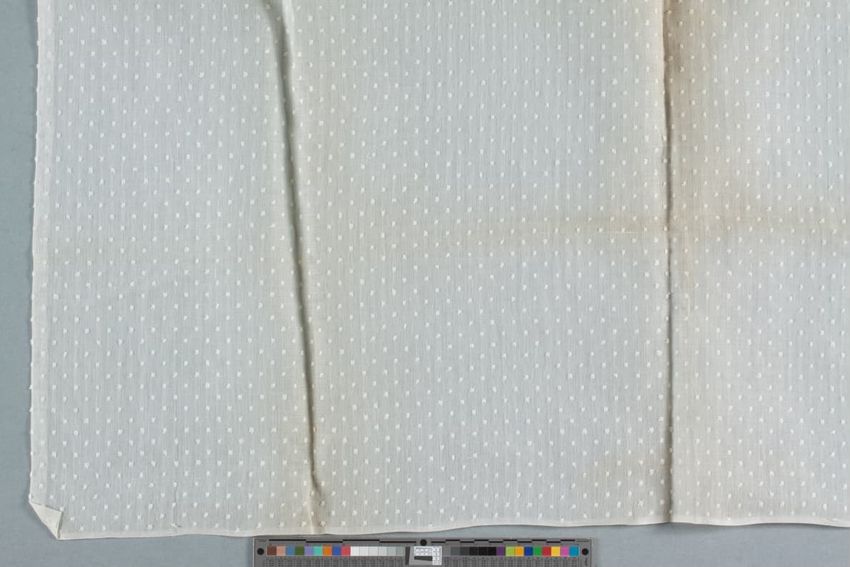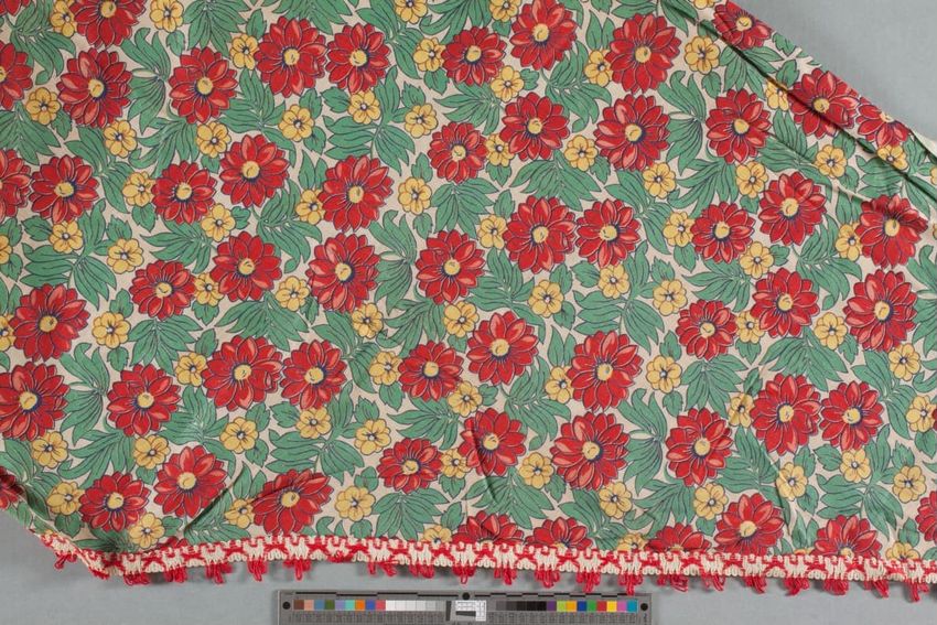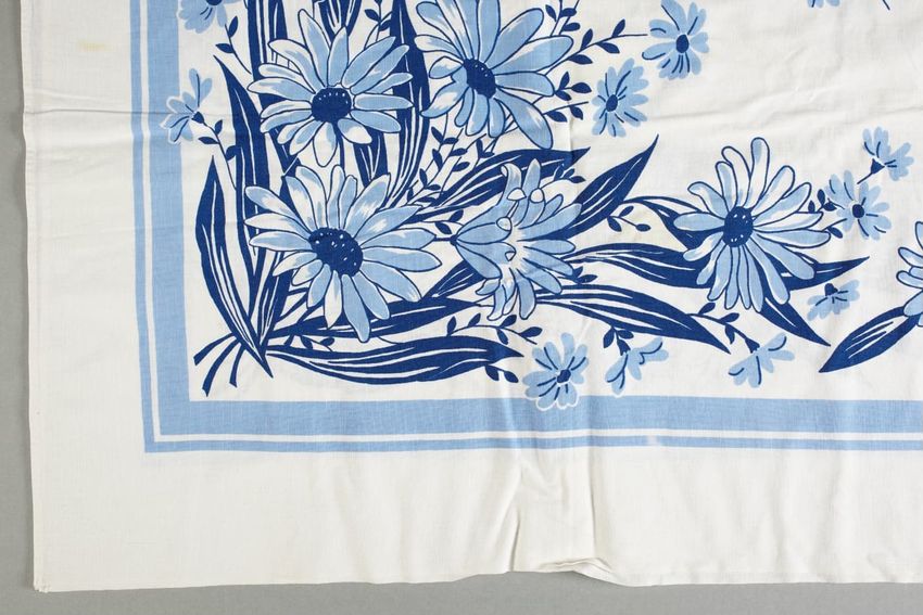 Hot pad; linen or cotton fabric in tan-colored with pattern printed in blue; different shapes, such as cheery, stars, floral, geometric, and possibly oriental characters are printed; construction is a rectanble-shaped fabric, lined with cotton batting; folded over itself, sewn down (by machine) and ...