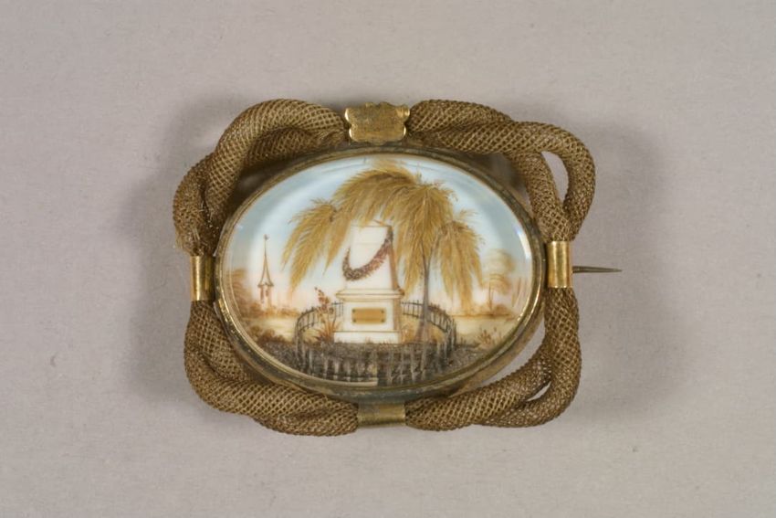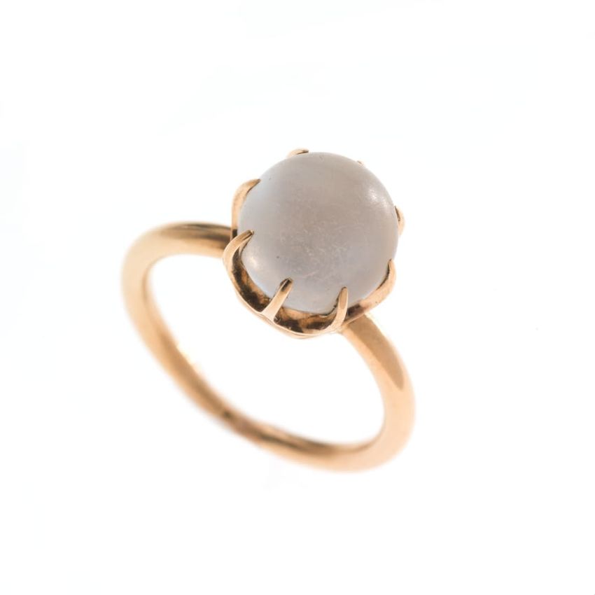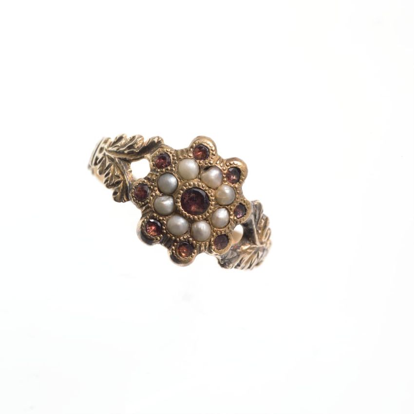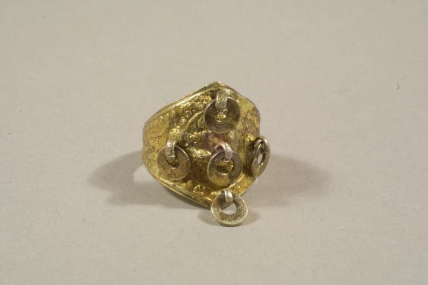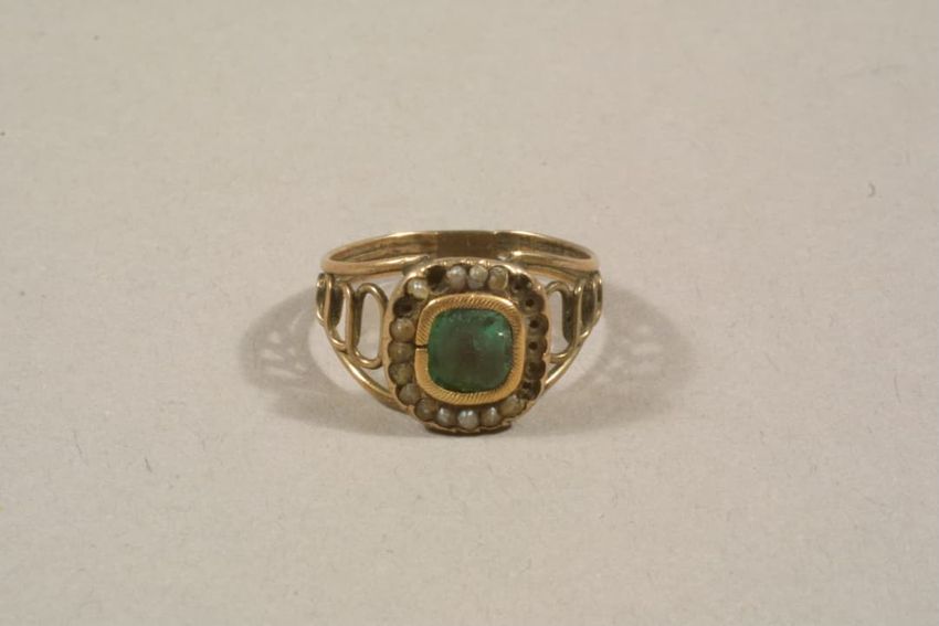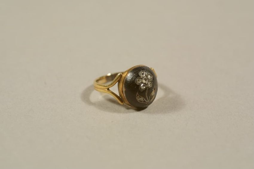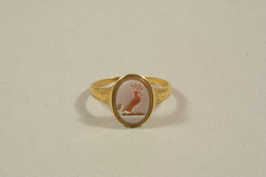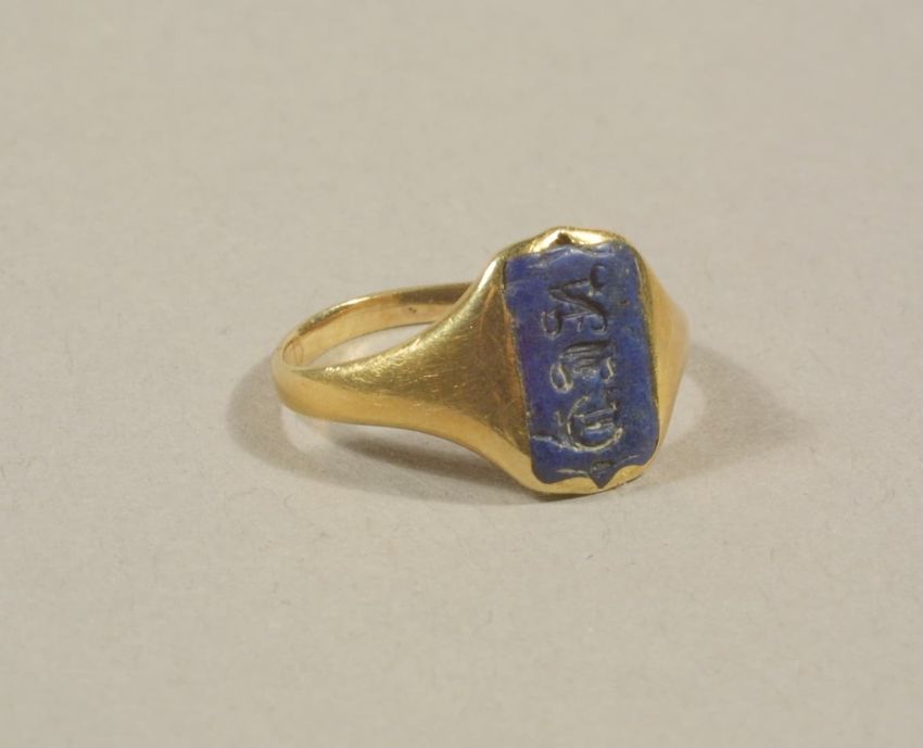 This gold ring with a center plaque in the shape of a scroll features the initials "EF" in an Asian-style script above a circular cut bezel set clear stone, possibly a diamond. The left shoulder is set with a tear-drop cut clear red glass "stone." The interior is inscribed with a death date and the ...