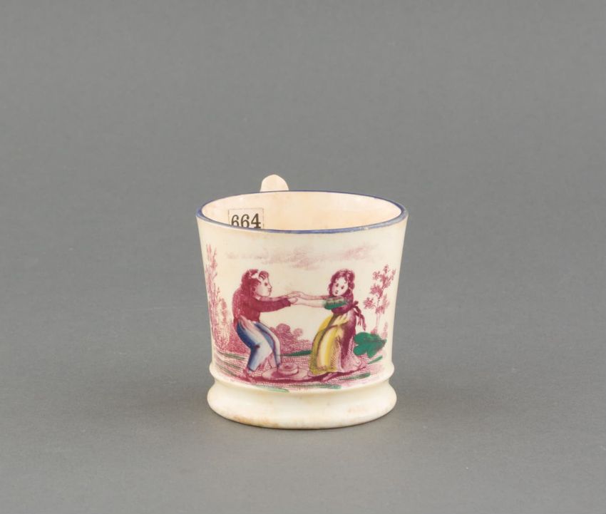 Hot pad; linen or cotton fabric in tan-colored with pattern printed in blue; different shapes, such as cheery, stars, floral, geometric, and possibly oriental characters are printed; construction is a rectanble-shaped fabric, lined with cotton batting; folded over itself, sewn down (by machine) and ...