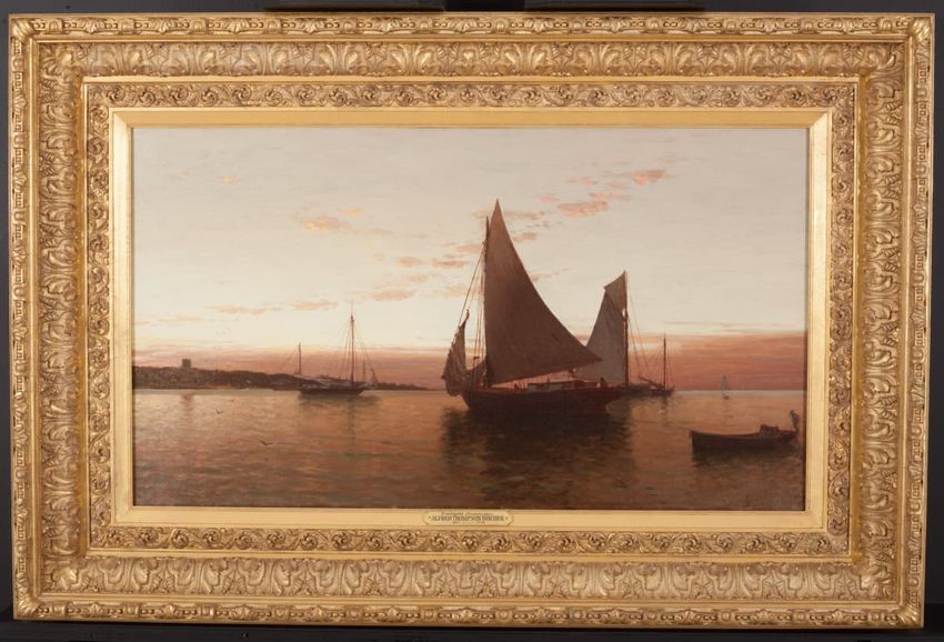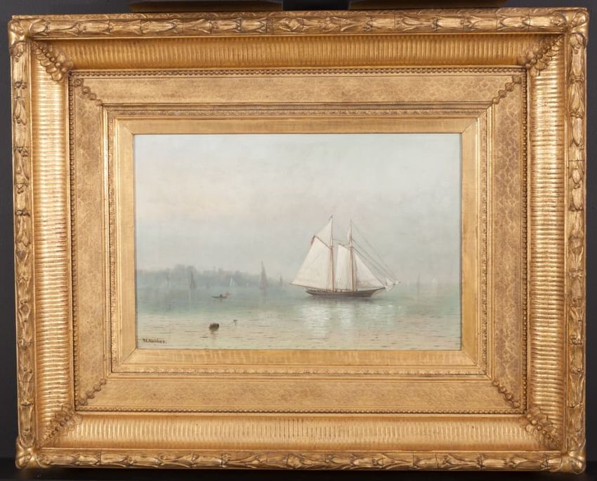 Colonial scene with figures, ship and houses illustrated in red, yellow, and blue on white ground.