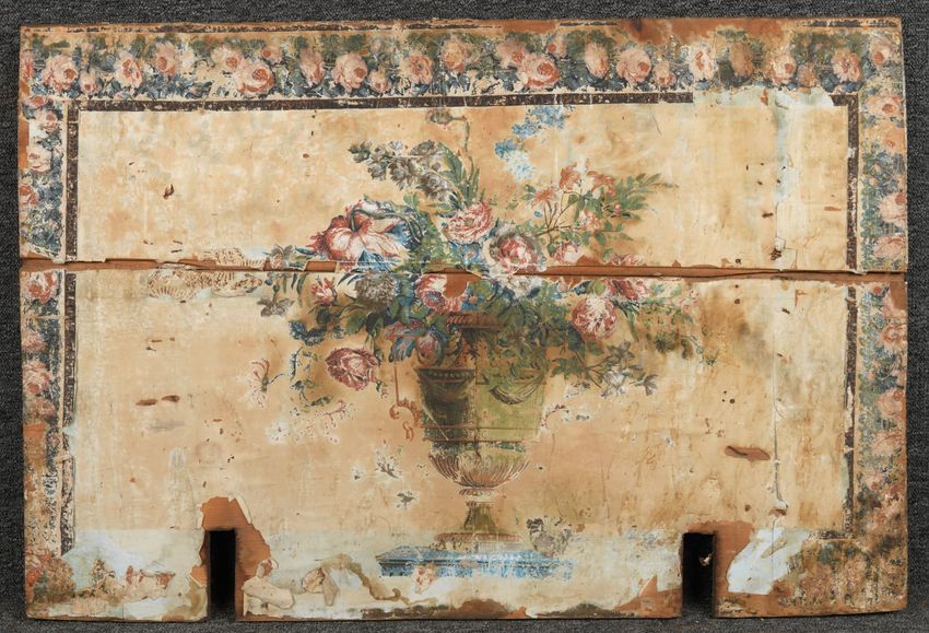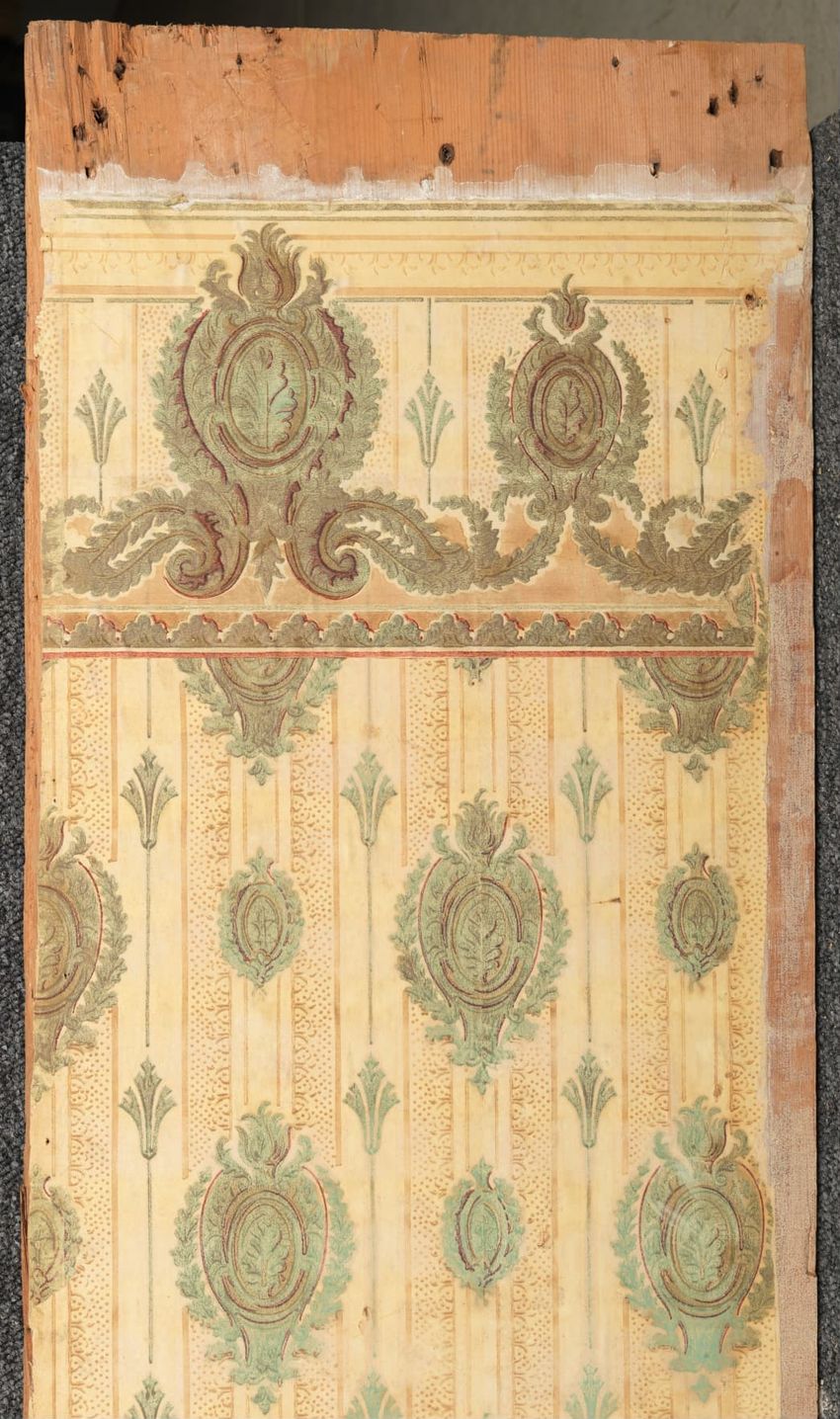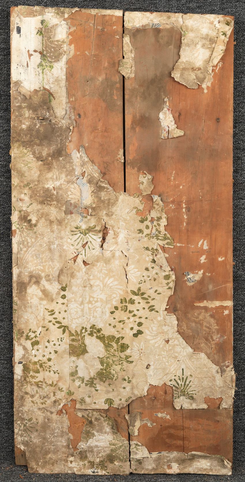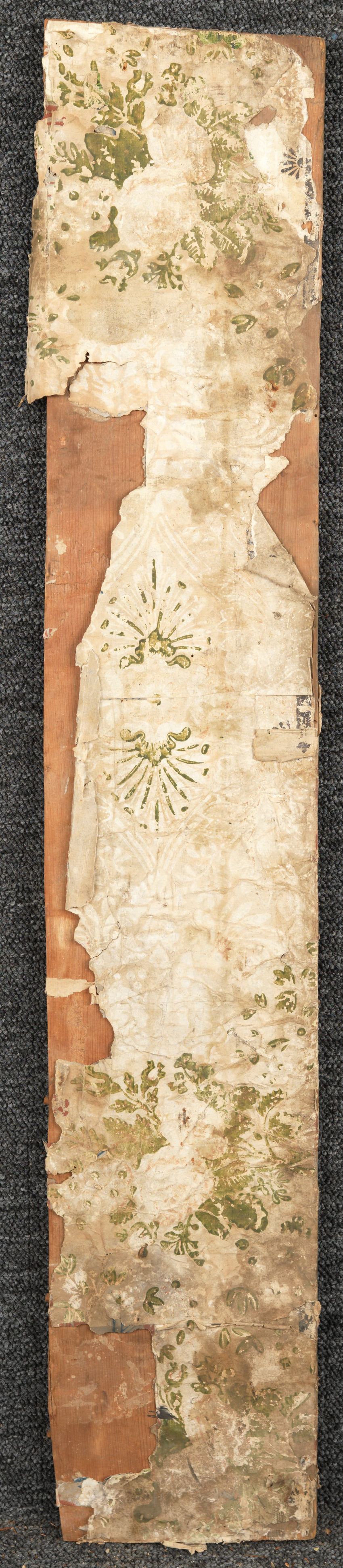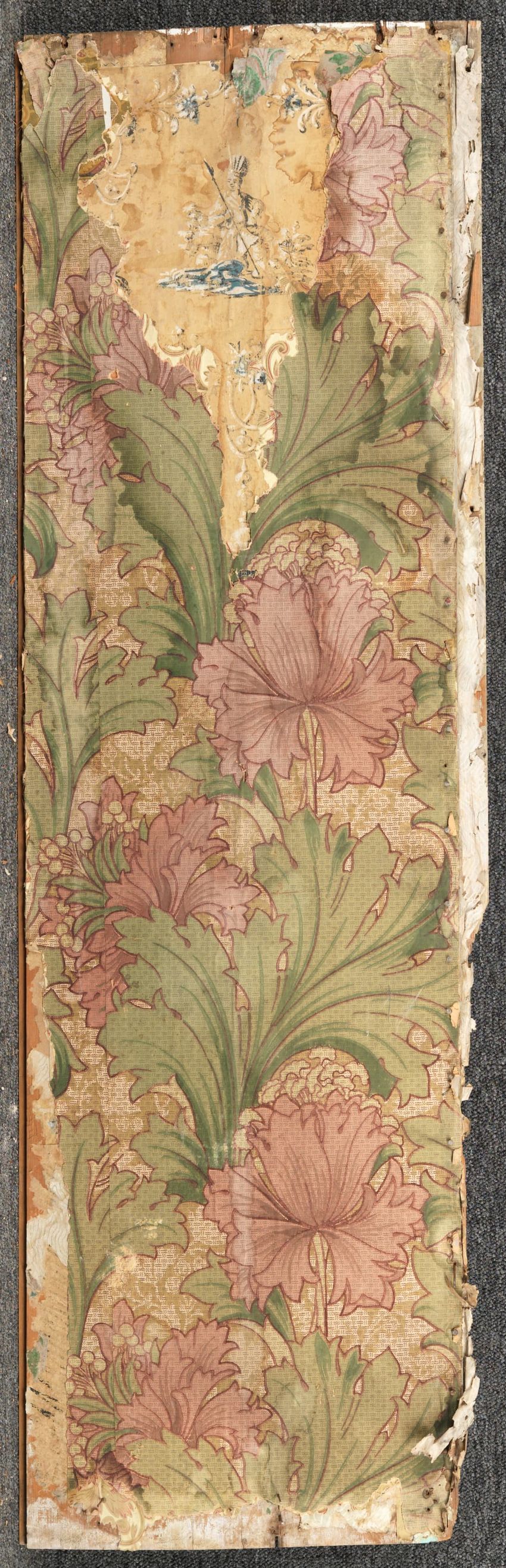 Board with many layers of wallpaper fragments. Topmost layer is Anglo-Japanese in brown, green, yellow, blue, and red (brown is flocked). Small floral with interlace and geometric designs. Other papers, from most recent to earliest, include a red floral on a brown ground with white and brown stripin...