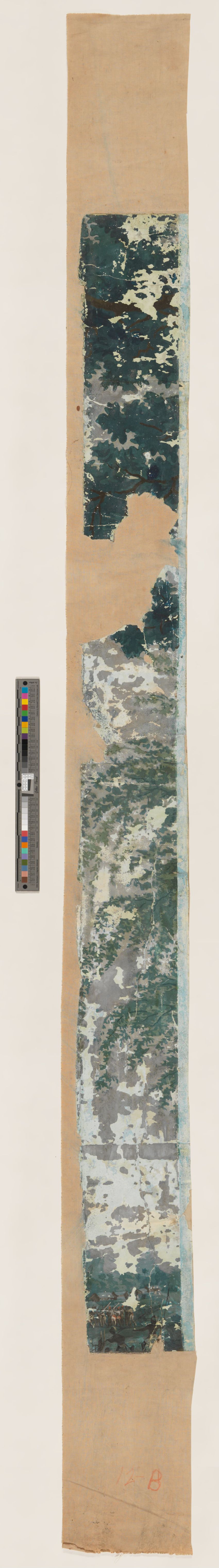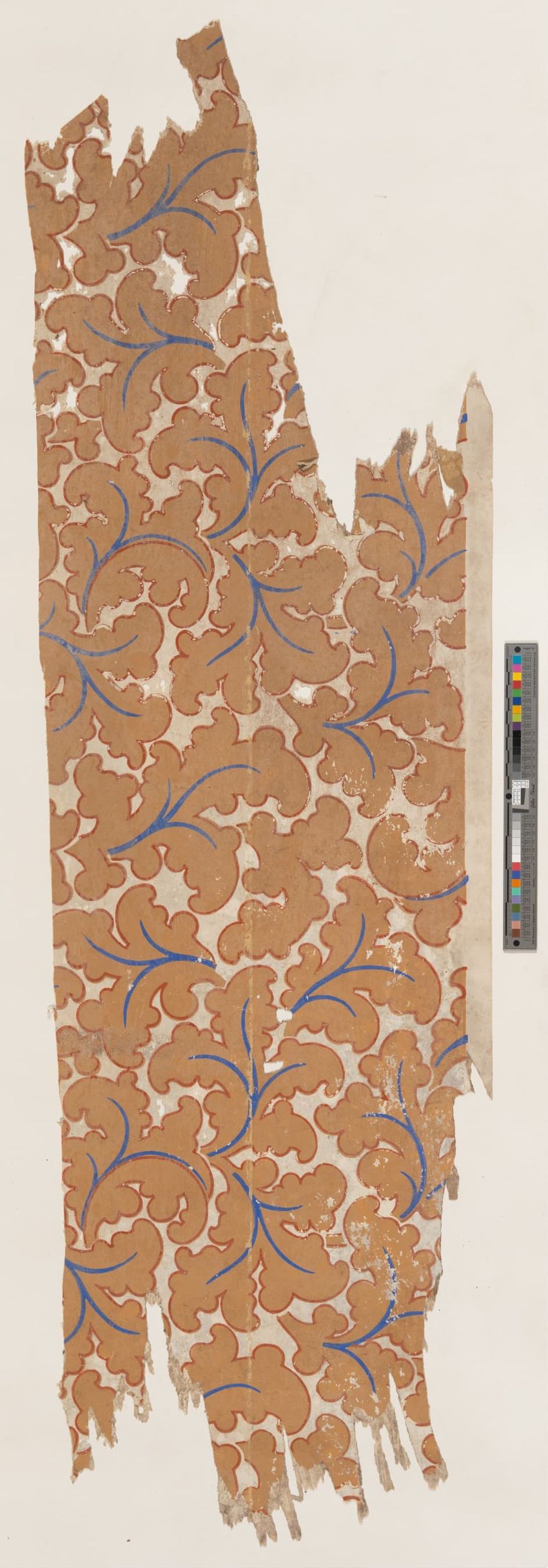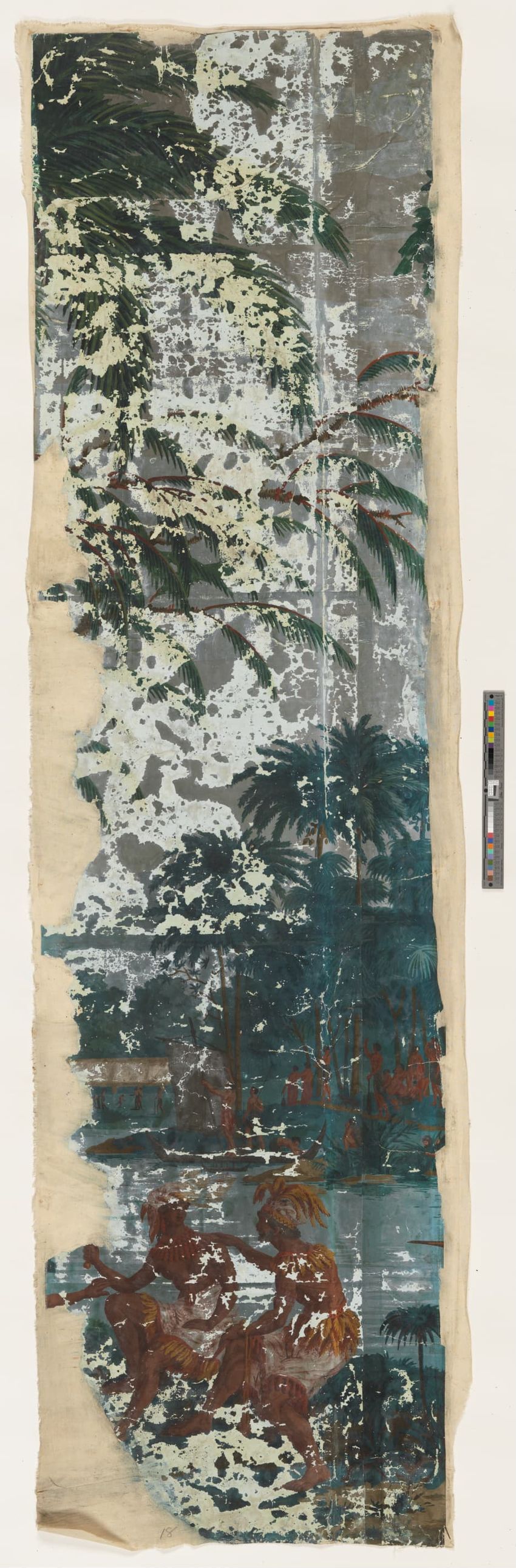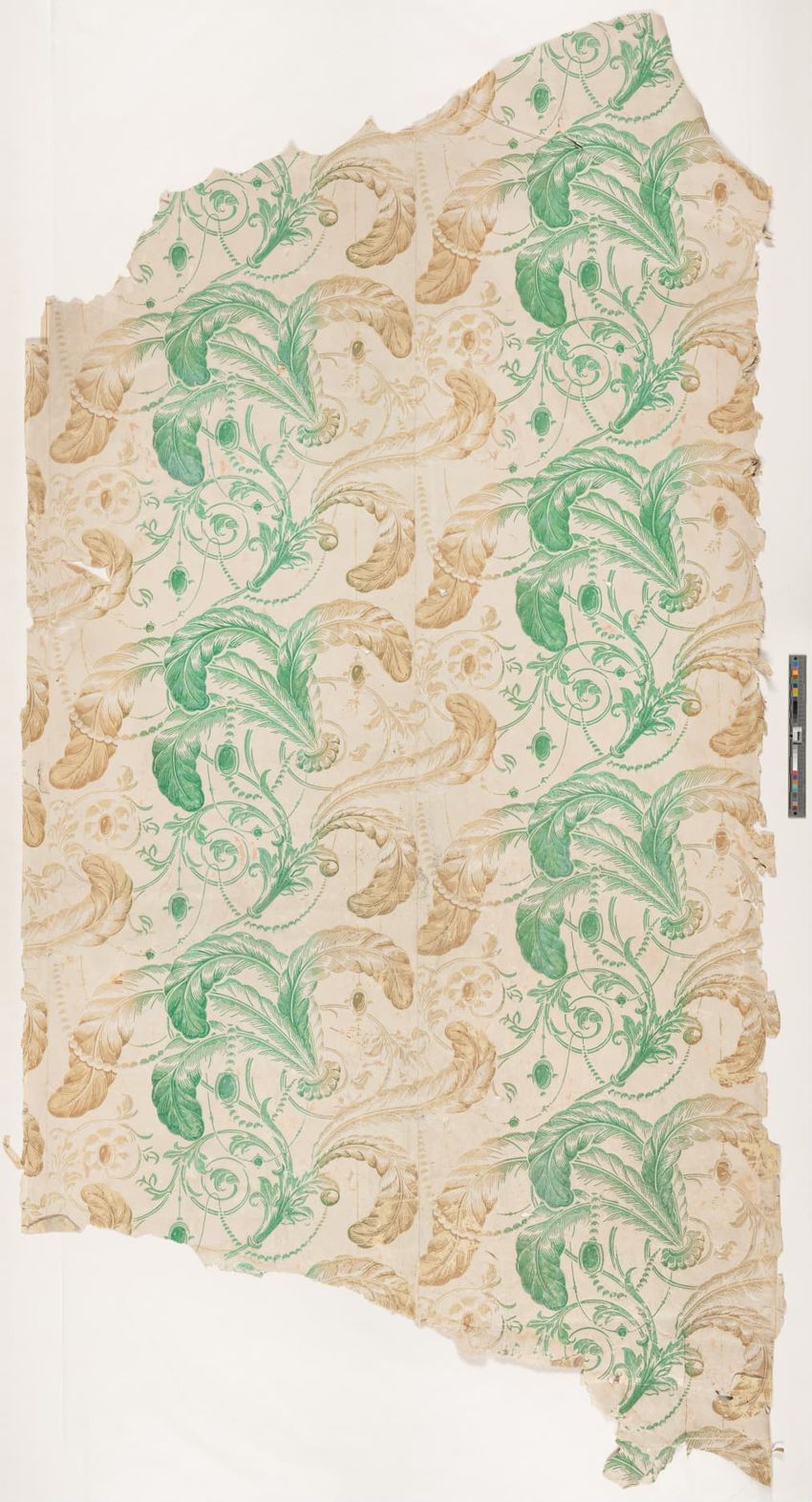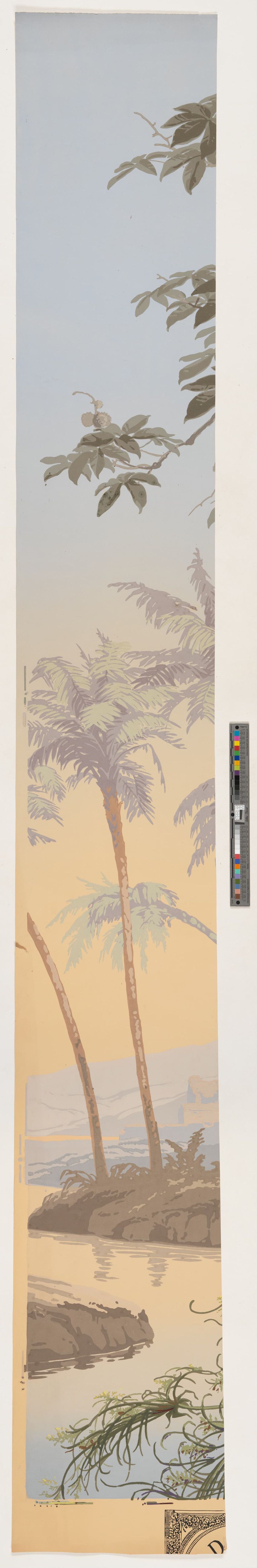 Wallpaper fragment. Scene of a large Gothic/Turkish structure (probably a cathedral) with a long, meandering bridge with stairs. A sailboat is departing and people ascend the stairs. Printed in blue, aqua, three greens, two browns, tan, grey, and pale pink on white ground.