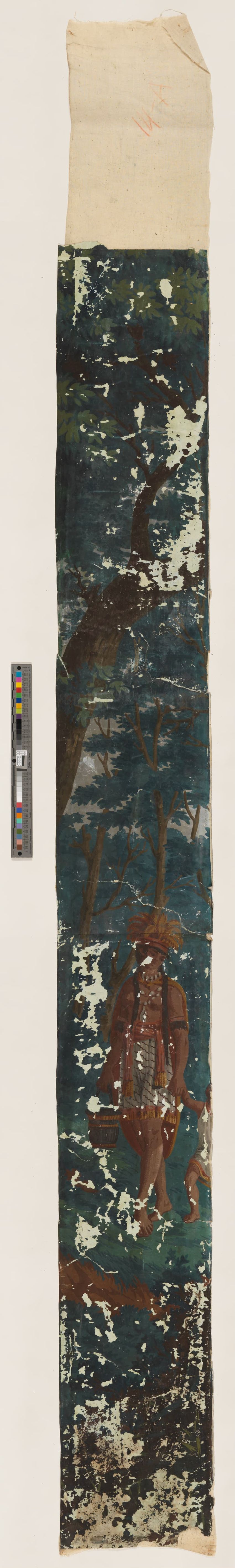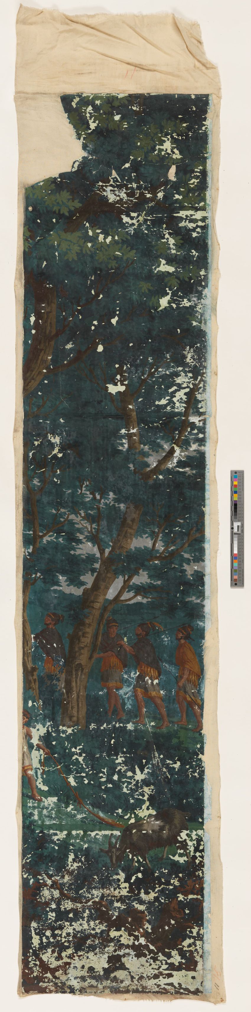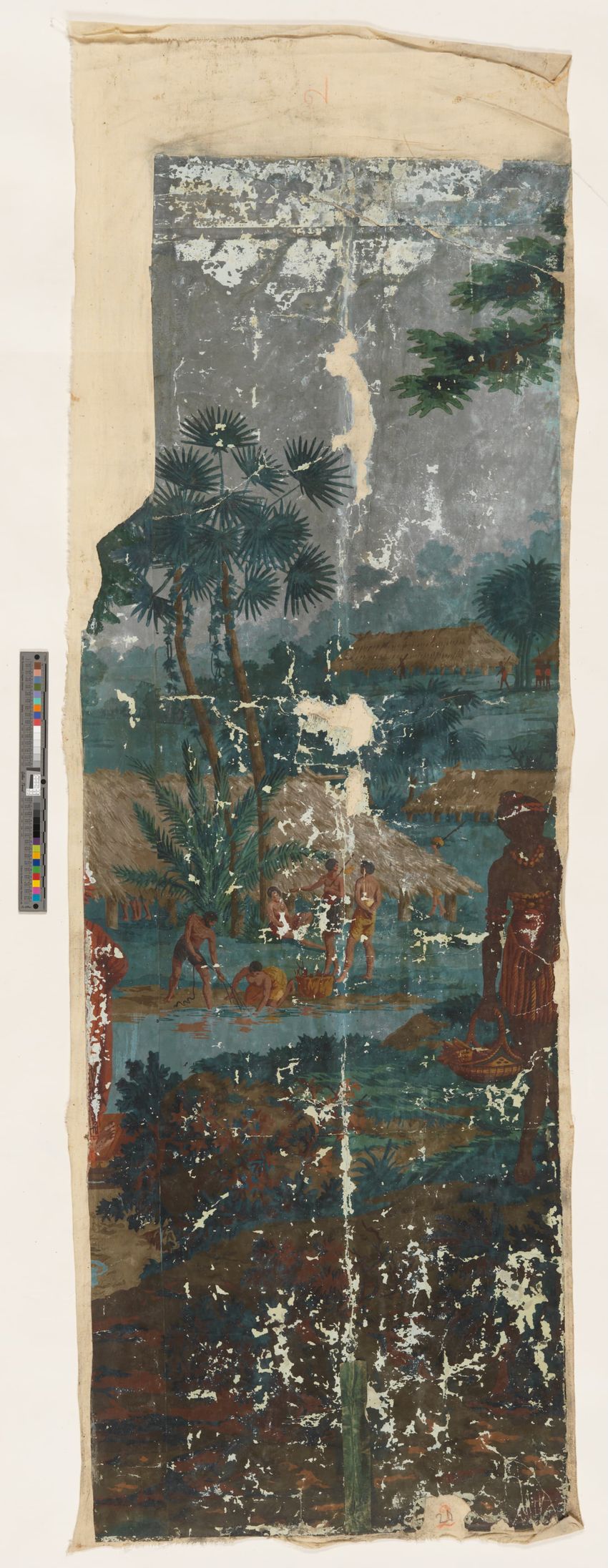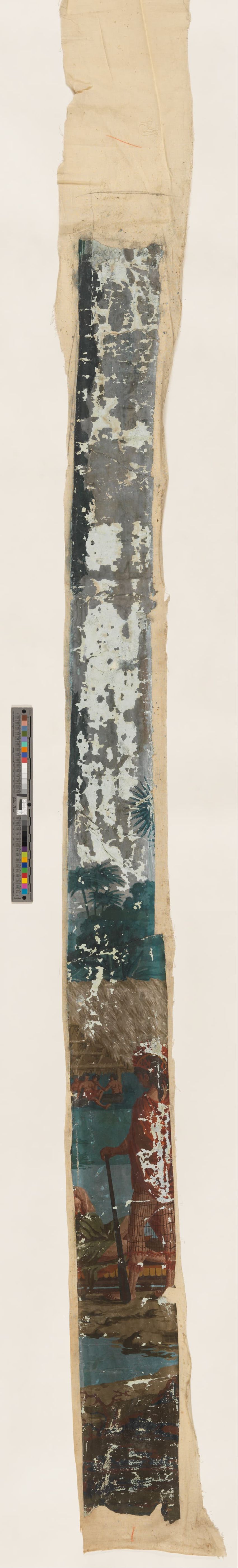 Wallpaper fragment. Scene of a large Gothic/Turkish structure (probably a cathedral) with a long, meandering bridge with stairs. A sailboat is departing and people ascend the stairs. Printed in blue, aqua, three greens, two browns, tan, grey, and pale pink on white ground.