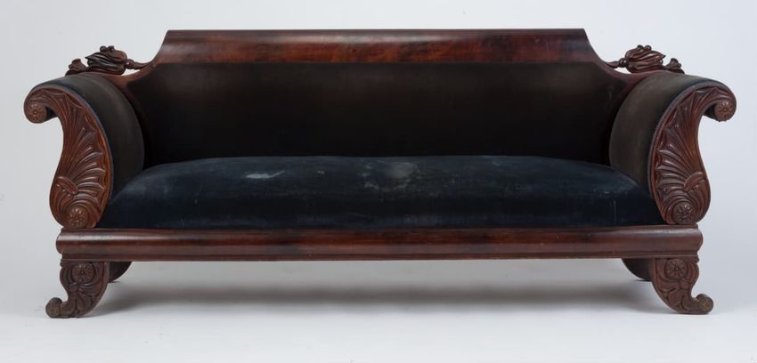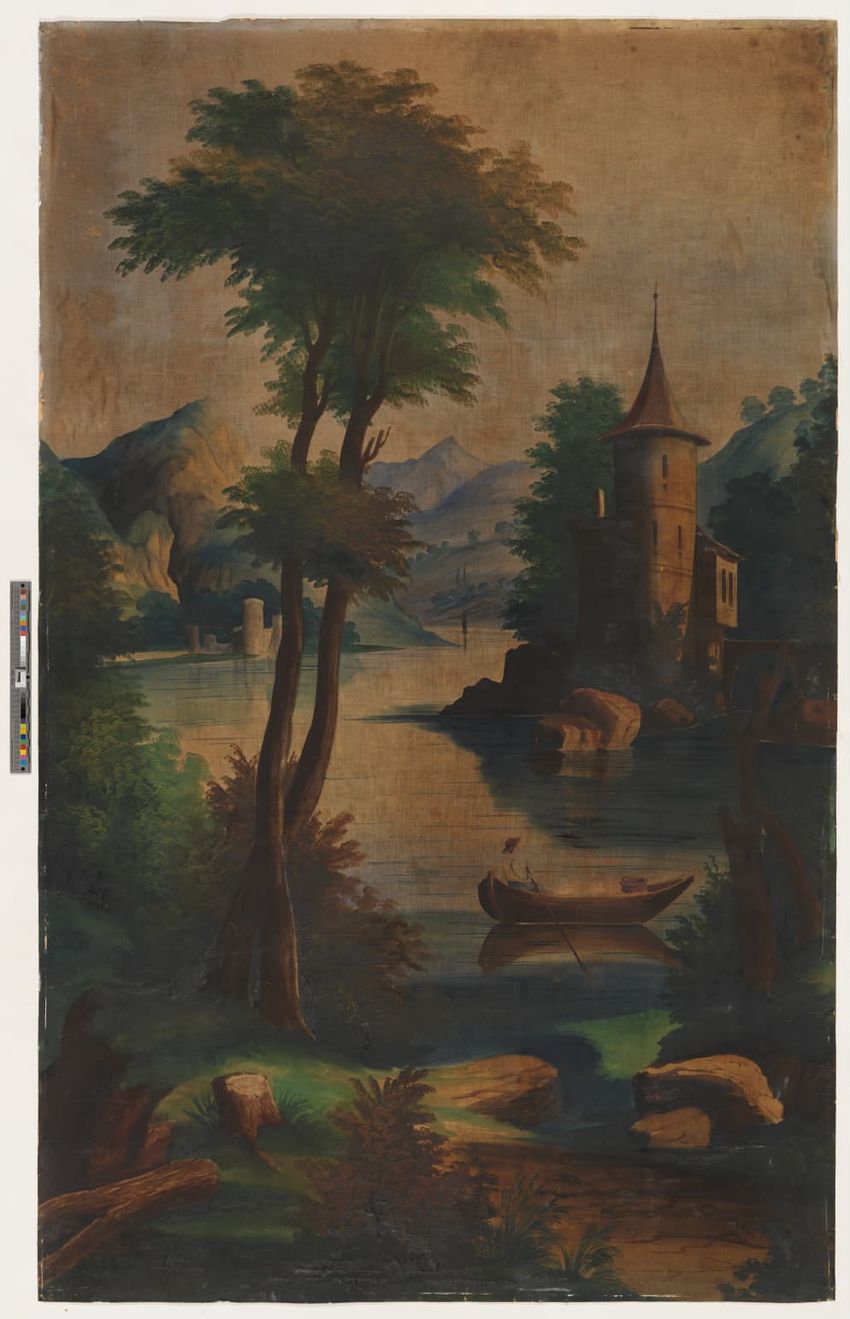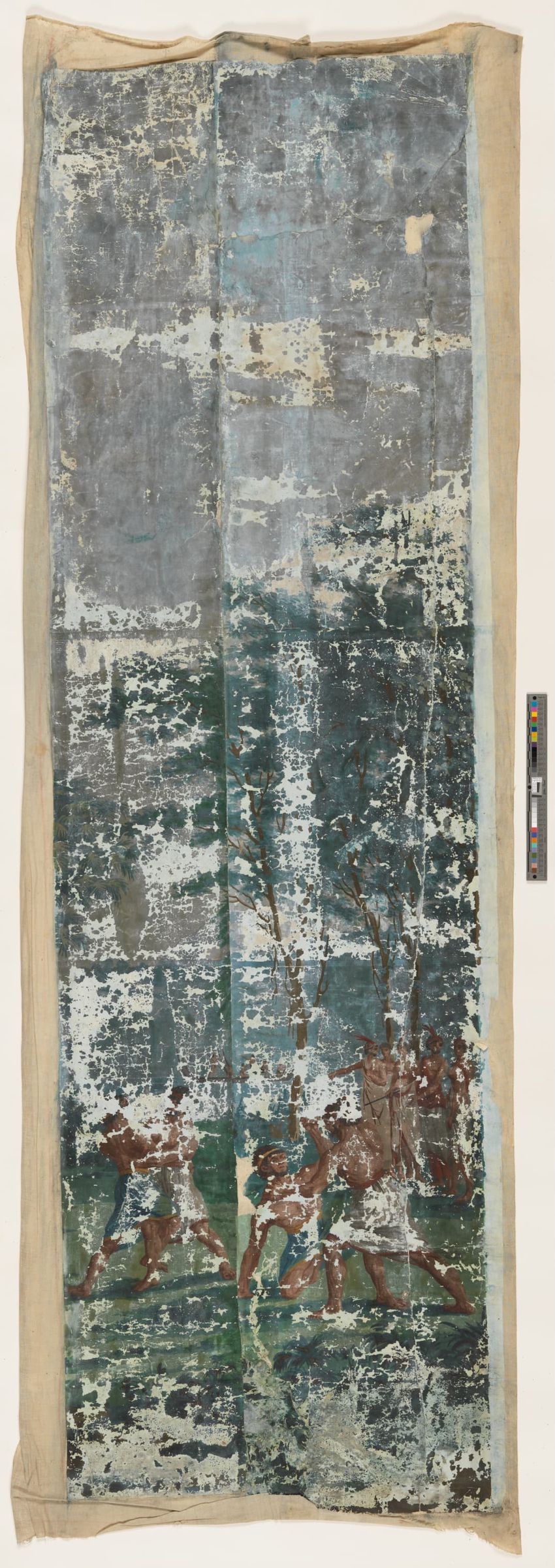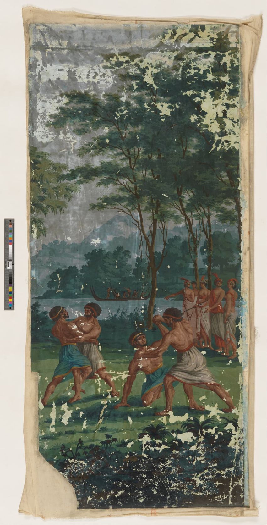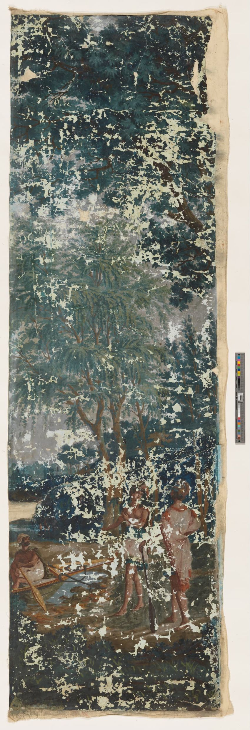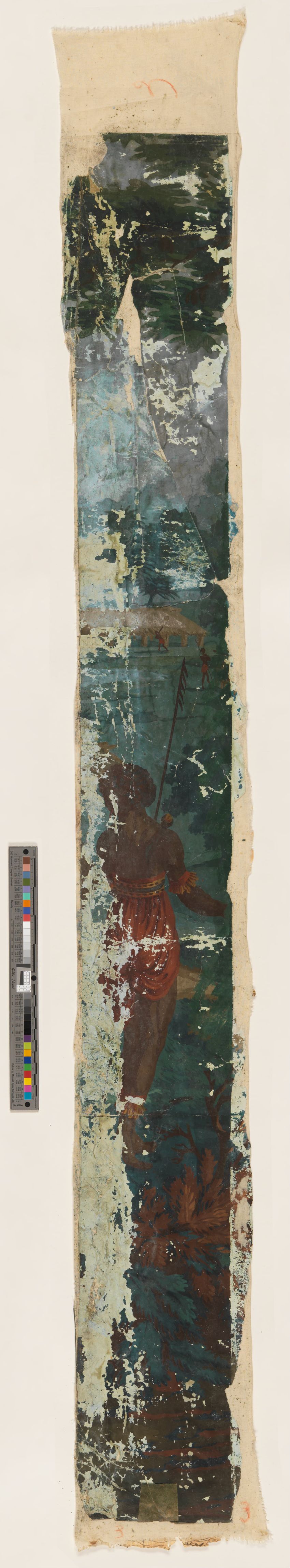 Wallpaper fragment. Scene of a large Gothic/Turkish structure (probably a cathedral) with a long, meandering bridge with stairs. A sailboat is departing and people ascend the stairs. Printed in blue, aqua, three greens, two browns, tan, grey, and pale pink on white ground.