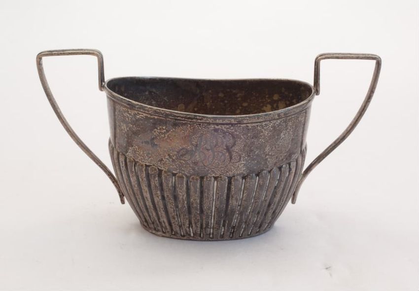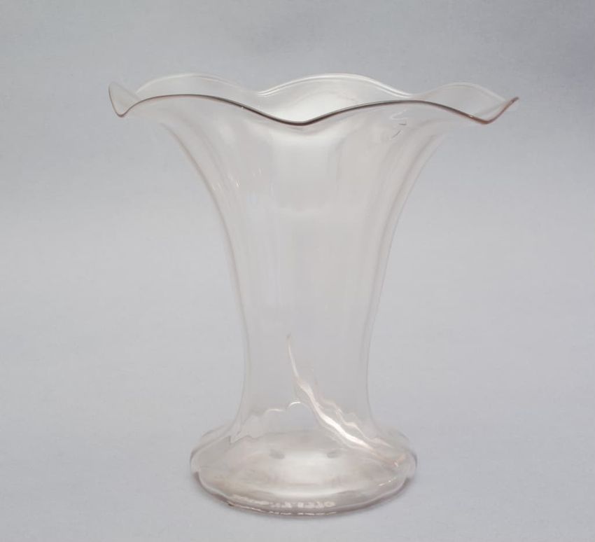 Arched shaped panel of red silk embroidered with cloud, wave, flower, bat, dragon, and rice bowl motifs in red, blue, white, pink, green, and yellow thread. Curved edge has a wave motif in shades of blue. Rice paper pattern attached to back of panel. Possibly a back shoulder panel off of a 'Mandarin...