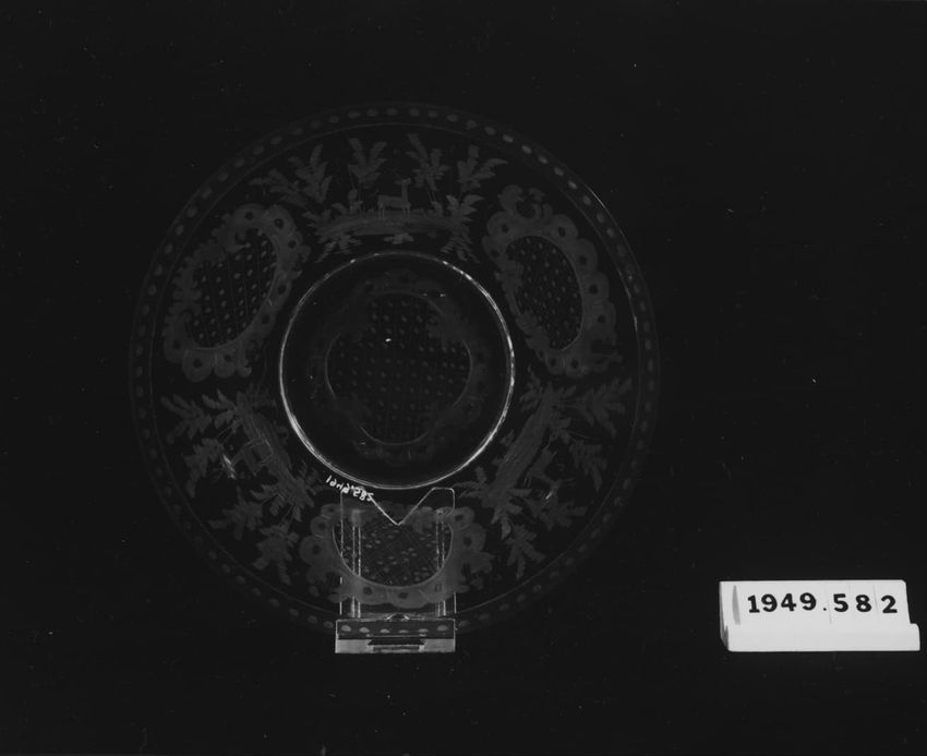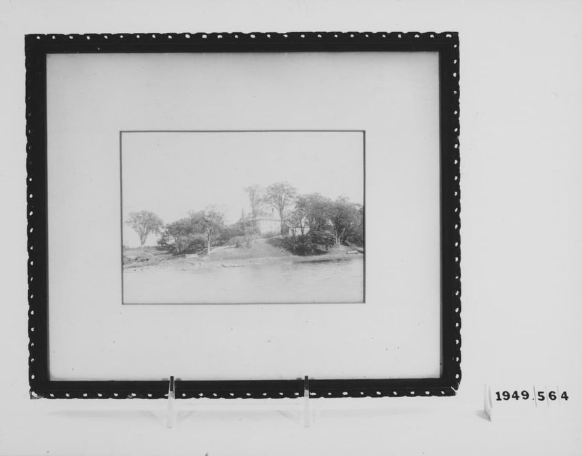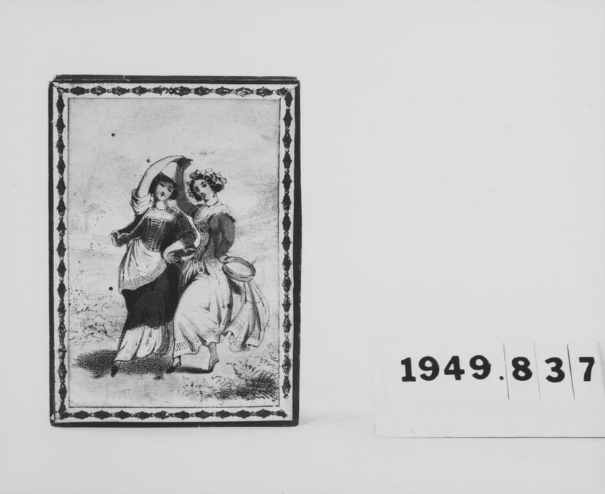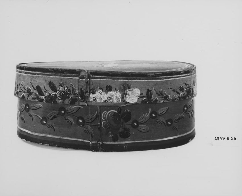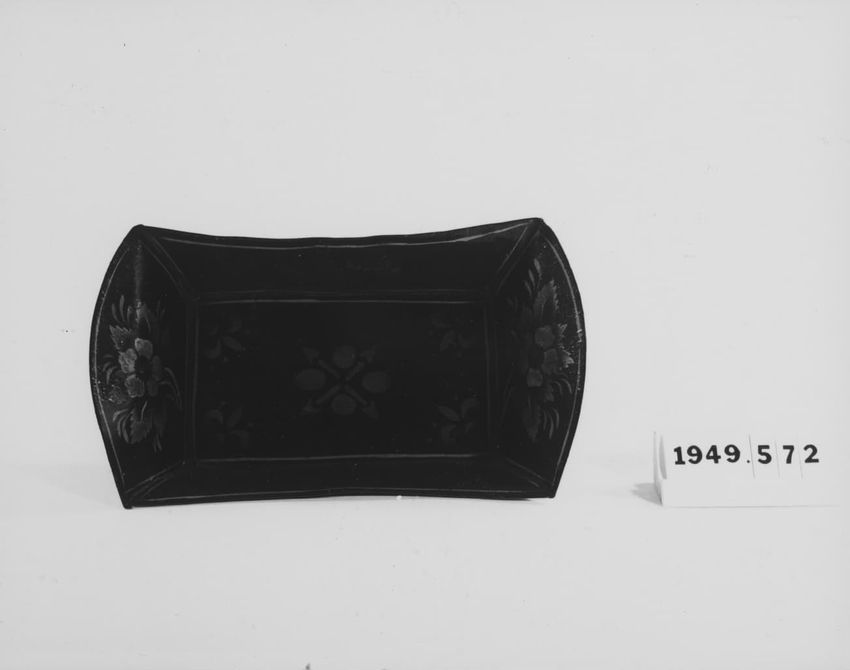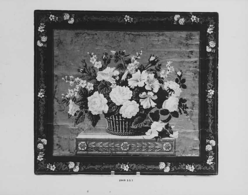 Fireboad; paint-decorated frame around wallpaper; wallpaper pattern depicts flowers (roses, lilies, and other small flowers) in open-weave basket on table top with floral design around edge of table top.