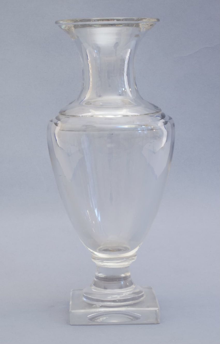 Crystal wine decanter with round body with cut fluting and a row of circles, flat bottom with cut hobstar, faceted neck with flared sterling silver rim with repoused vine and berry design.