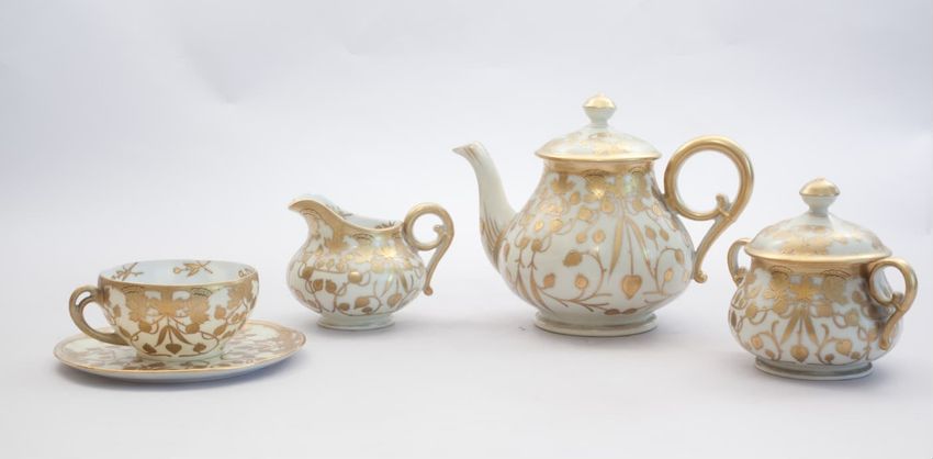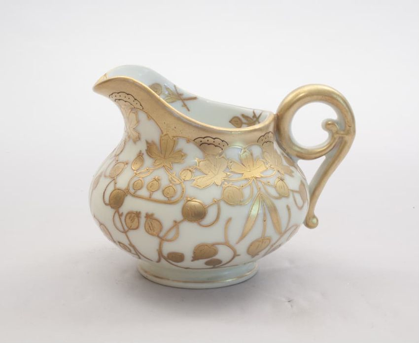 White porcelain sugar bowl with painted gold flower buds, leaves, and vines. The sugar bowl has two handles painted gold. The cover matches with gold painted leaves, buds and a painted gold finial.