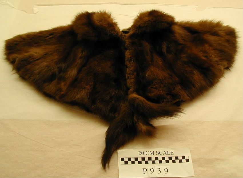 Short women's cape made of long, dark brown fur. The cape has a wide collar that goes all the way around from the front to the back and folds down. There is a center opening with five metal loops on the left side and five hooks on the right. Just below the top hook and loop closure, there is a metal...