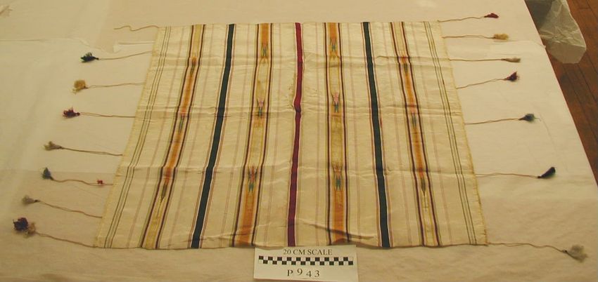 Square shaped striped silk shawl with tassels. The ivory ground of the shawl is patterned with alternating narrow and wide multi-colored stripes. Four of the widest stripes have multicolored patterned centers. The left and of the shawl has eight multicolored tassels, the right end has seven.