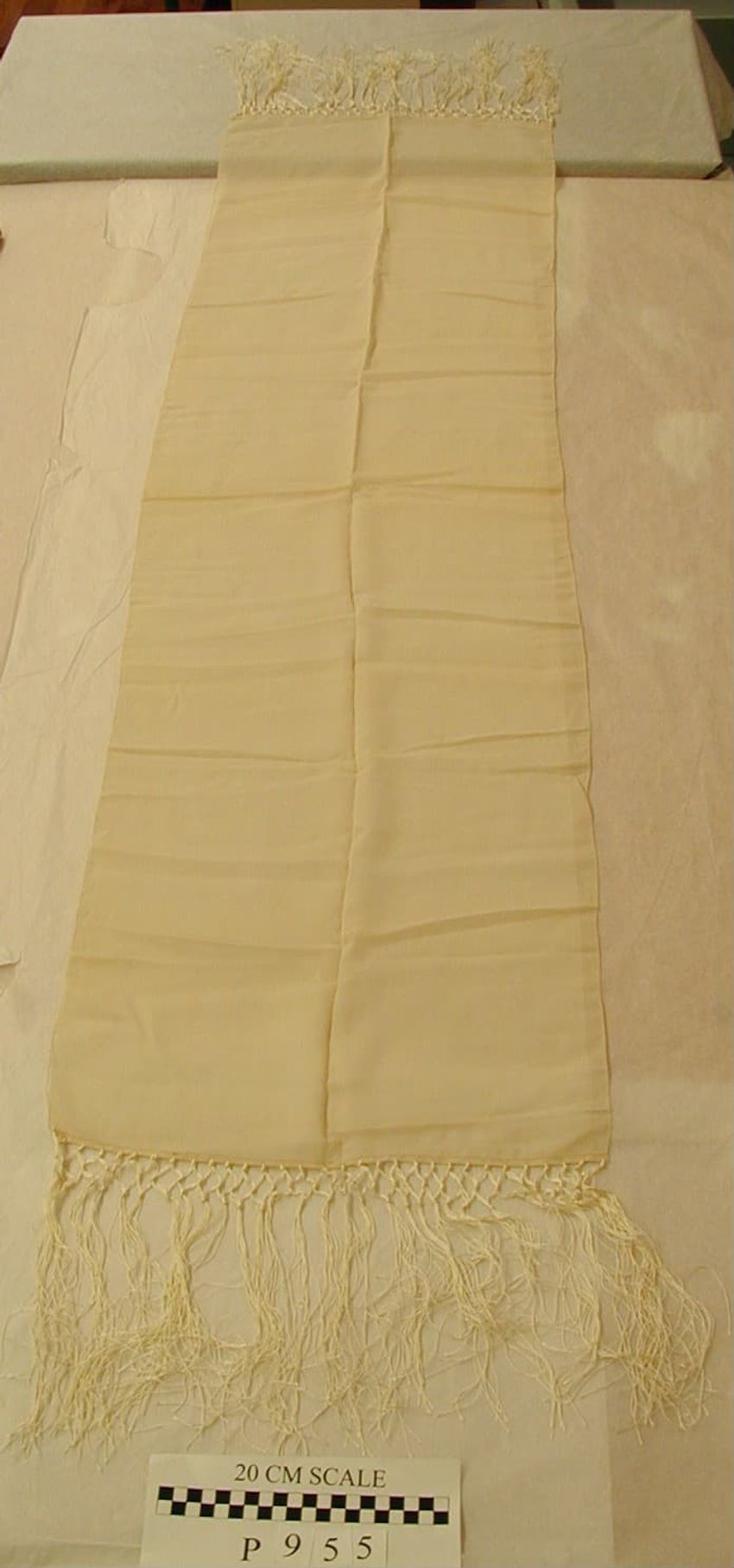 Rectangular sheer beige silk crepe shawl with long fringe. The body of the shawl is plain and the seams around all four edges are decorative with interconnected tiny holes. The two short ends have long beige fringe that extends from three decorative rows of knots.