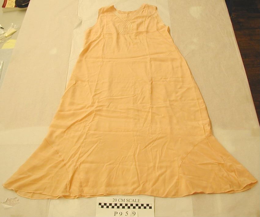 Long sleeveless peach silk nightgown. The neckline is a v-shaped and is bordered by three narrow bands of thicker peach silk connected together and attached to the dress by decorative stitching. At the V the bands of silk are woven together and then continue on down forming an oval or teardrop shape...