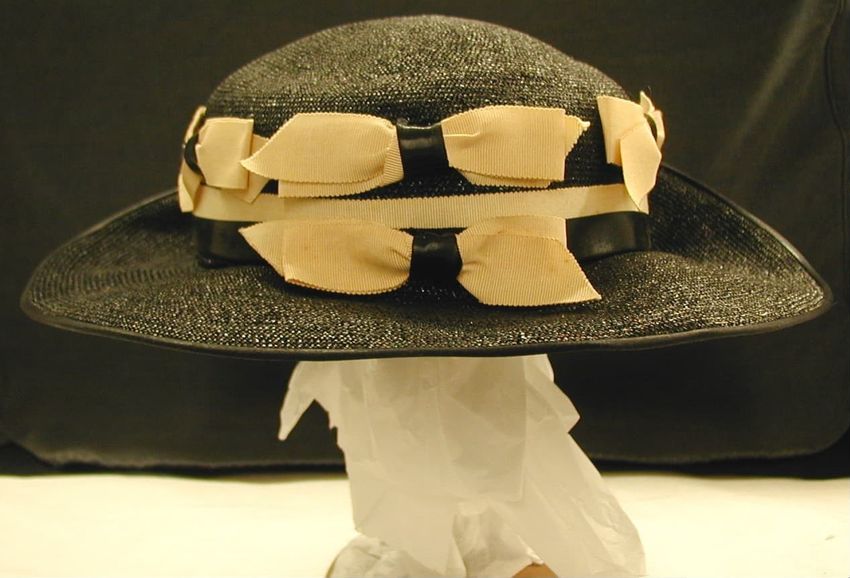 Women's black straw hat. The hat has a slightly rounded crown on top and its brim is folded up in the back and is stitched tot he side of the crown. The straw is black and shiny and is stiff. The brim is edged with a narrow border of black silk that wraps underneath the brim. Around the bottom of th...
