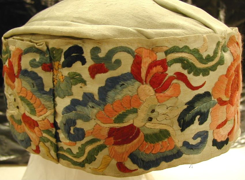 Women's Chinese silk hat with embroidered flowers. The hat has no brim, a high crown with straight sides and a slightly rounded top. The top is made of gray brocaded silk with a pleated strip running across the middle. The sides of the crown are made of the same gray silk, but have colorful embroide...