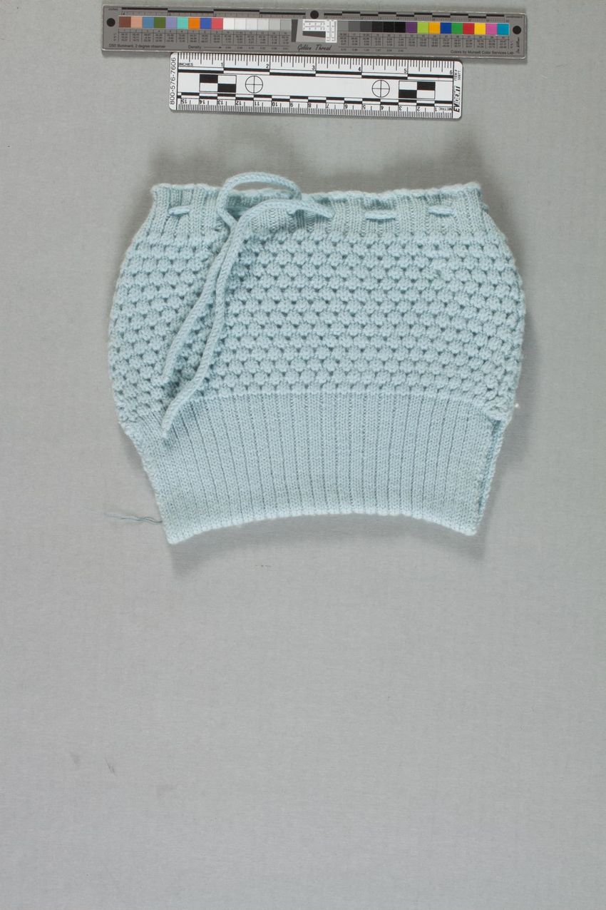 Navy wool [baseball-type] cap with a medium sized brim; interior lined with canvas on the crown, flannel on brim, and leather around circumference; six eyelets for ventilation; manufaturer size label inside band; machine sewn and manufactured.