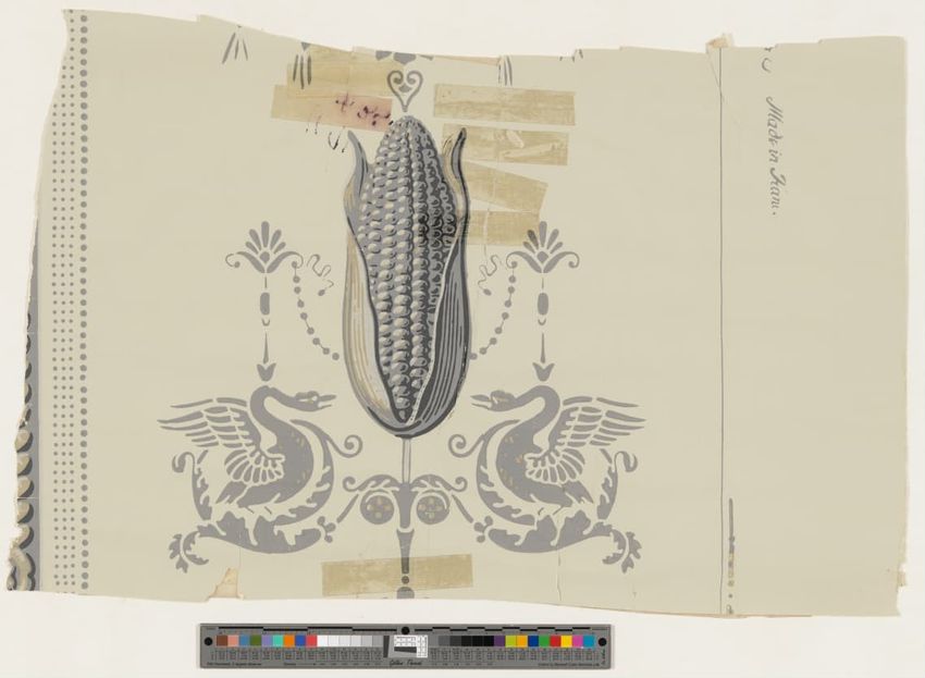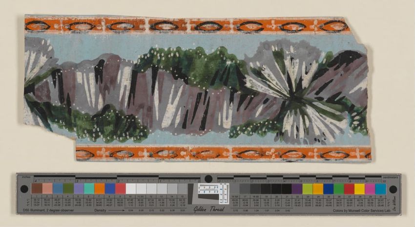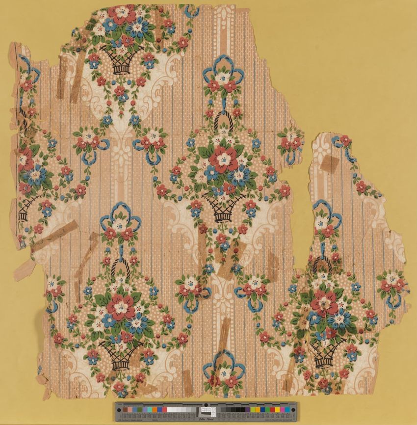 Unused fragment of wallpaper. Naturalistic pattern depicting birds carrying various grasses and branches, butterflies and insects. Block-printed in yellow, orange, pink, mauve, brown, greens, grays and blues on a pale peach ground.