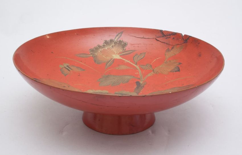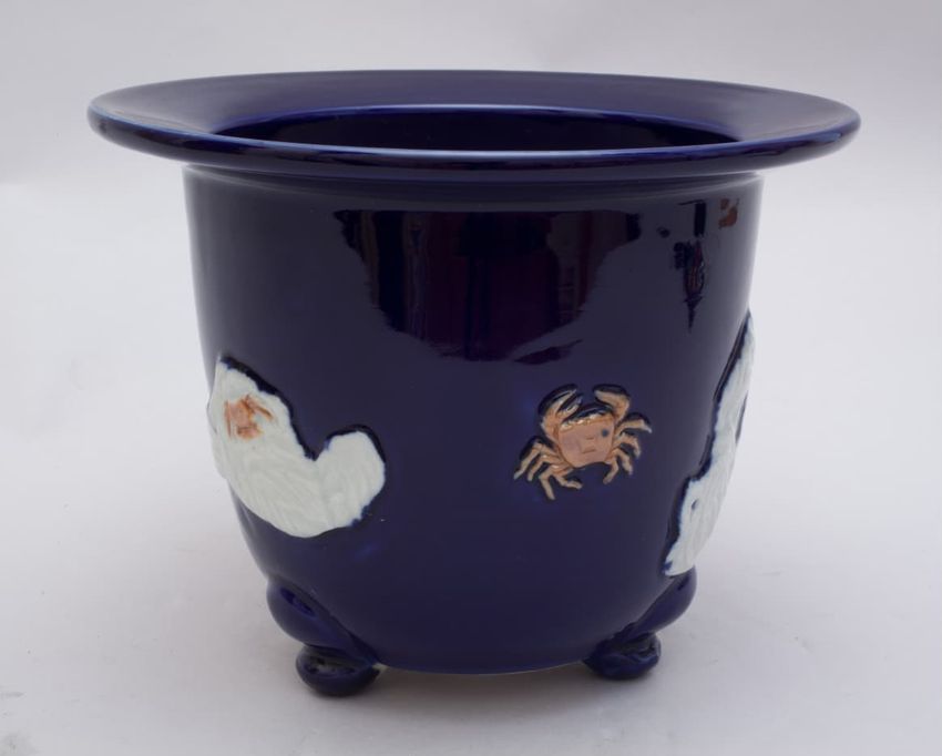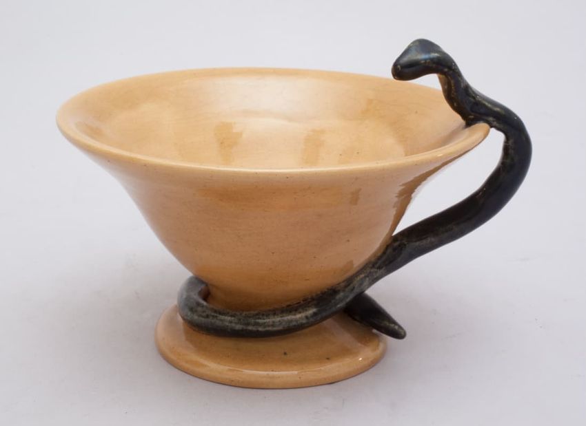 Footed bowl with snake handle. V-shaped bowl with flared rim, dark blue glaze. Aqua snake wraps around footed base, arches out and rests on edge rim. Nannie Borden Phillips butterfly mark scratched on bottom.