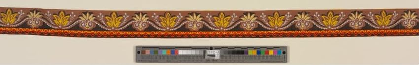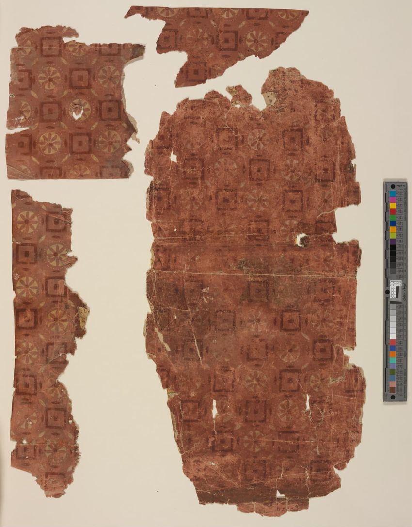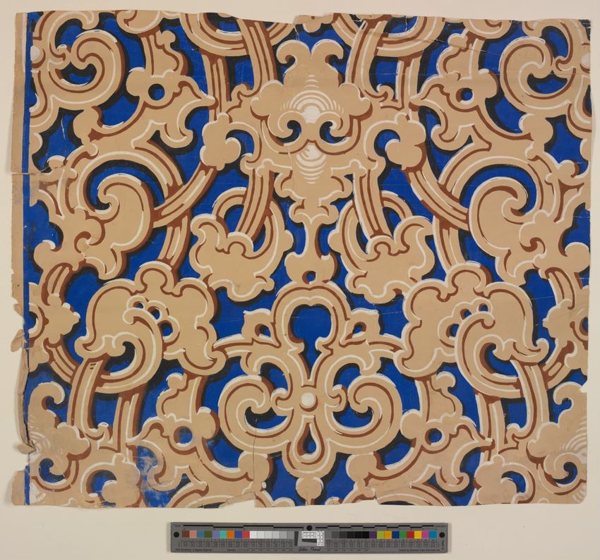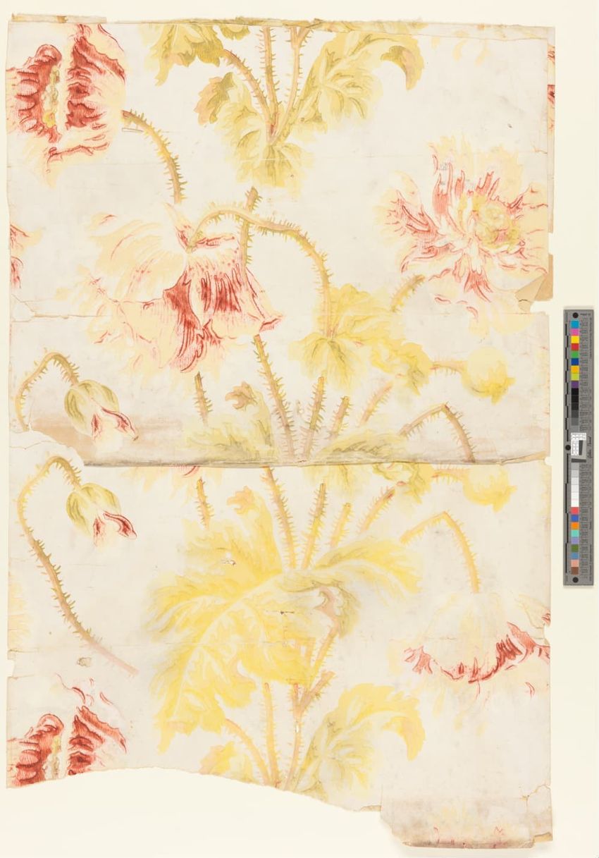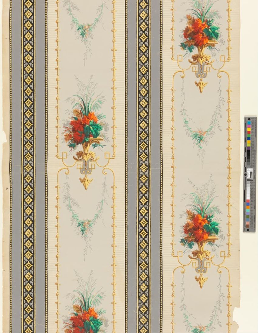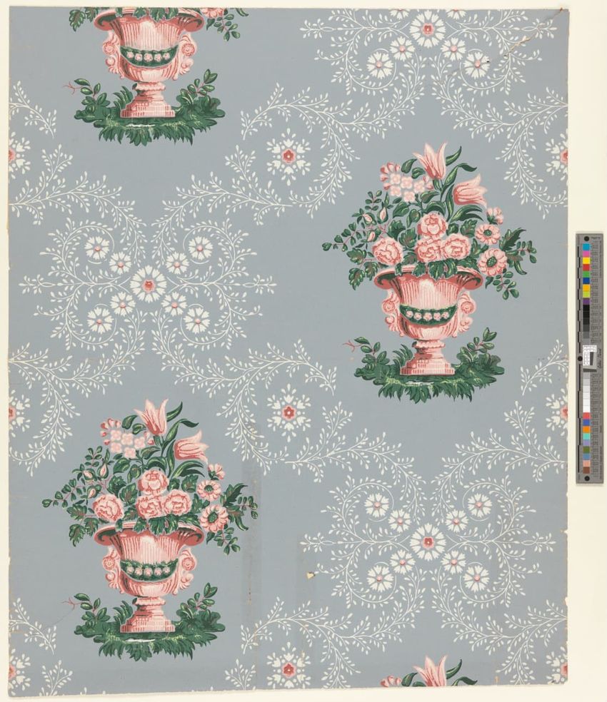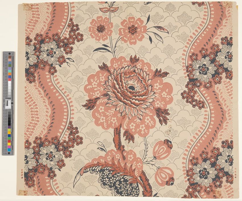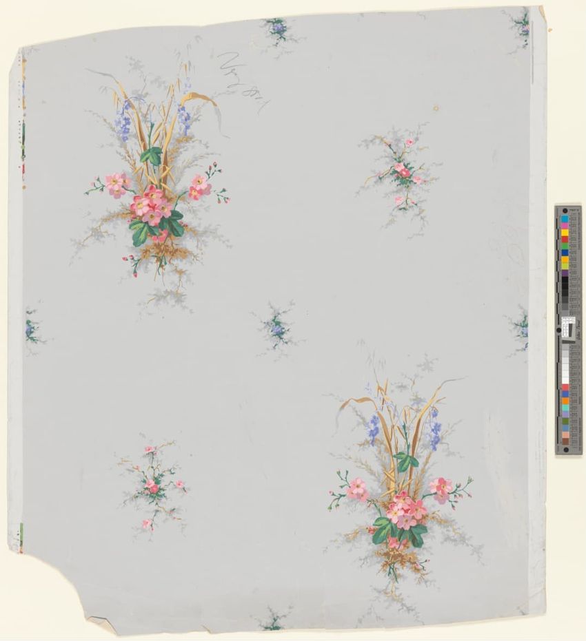 Unused wallpaper fragment. Bouquet and sprig pattern. Large bouquets of pink and white apple blossoms alternate with small sprigs of violet flowers. Block-printed in twenty-four colors: yellow, white, three olives, four greens, red, two pinks, three mauves, three browns, blue, aqua, four violets ...