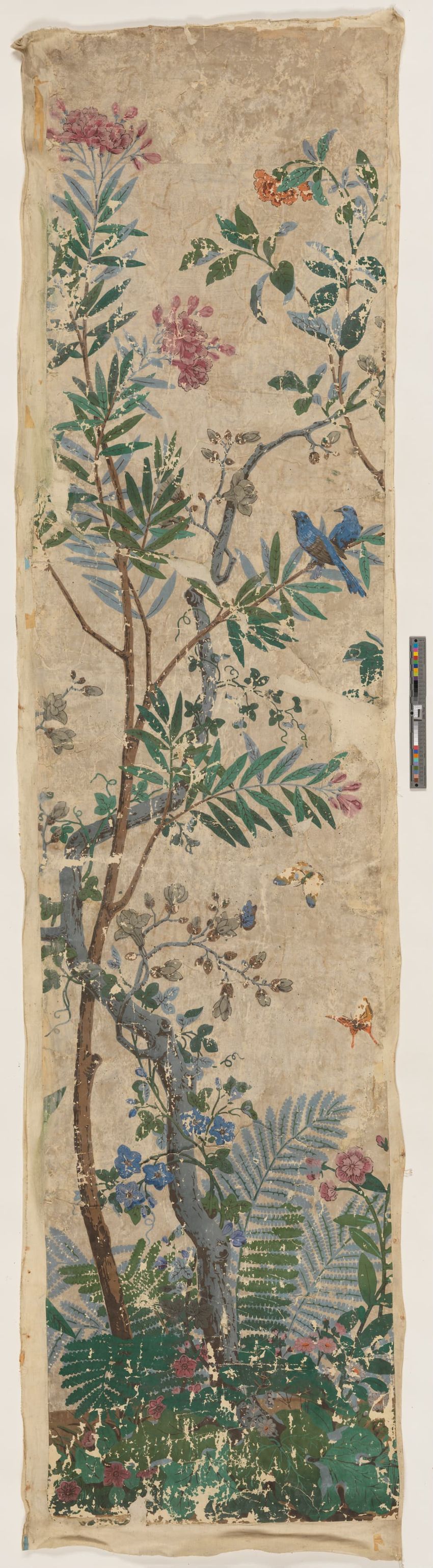 Wallpaper fragment. Scenery figure pattern with alternating scenes of bridges, water, sailboats, buildings. Scenes are framed by Rococo style cartouche with C-scrolls and foliage. In the background is an imitation marble pattern between the cartouches. Printed in three browns, blue, pink, white, gre...