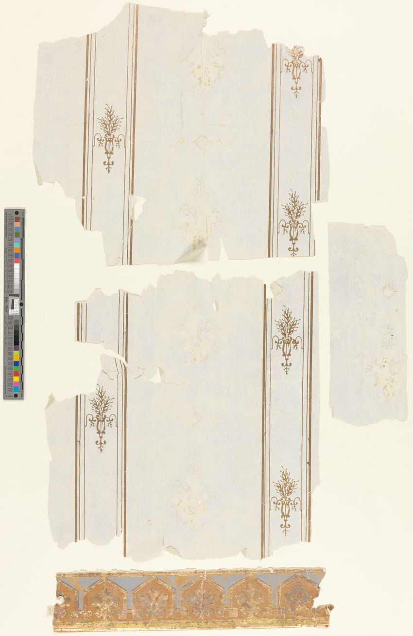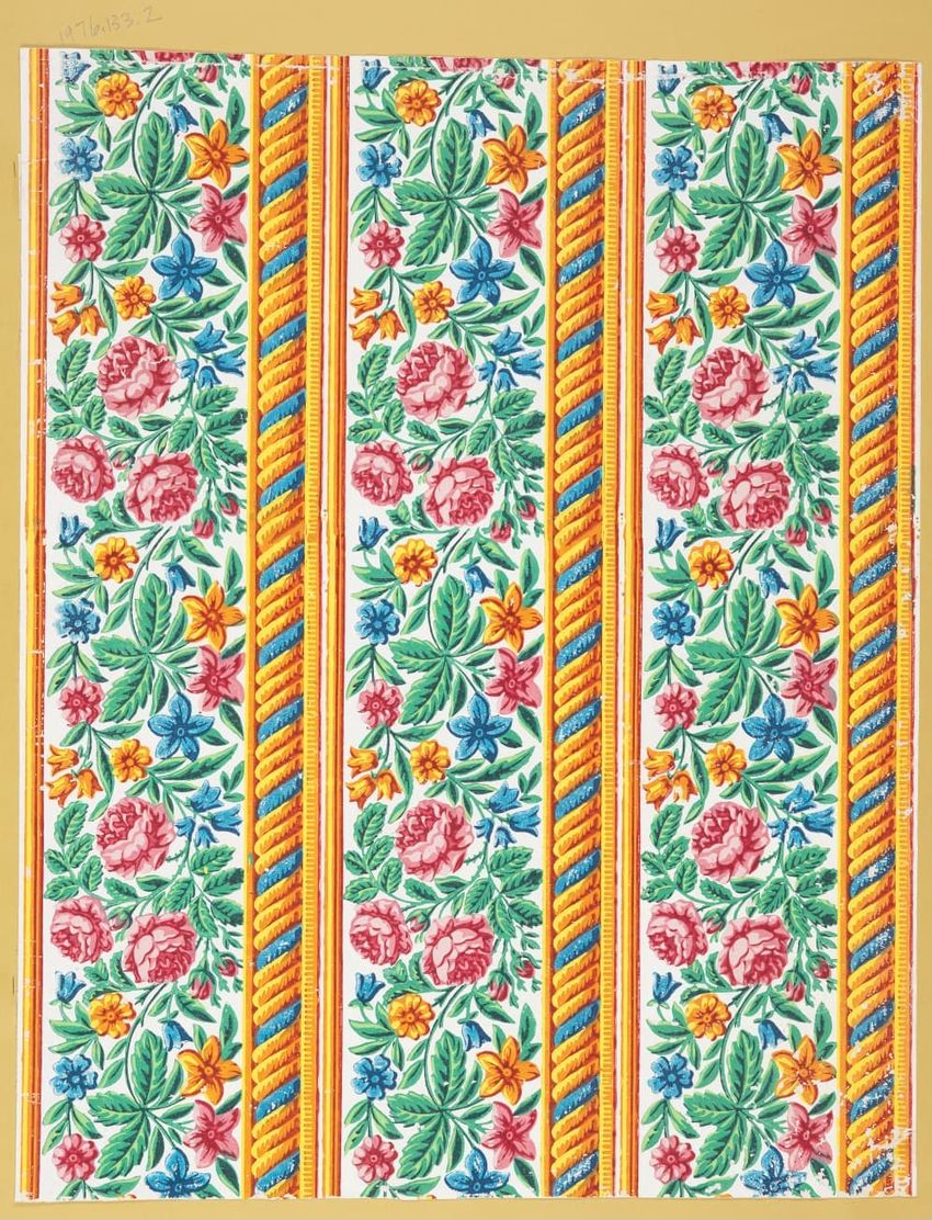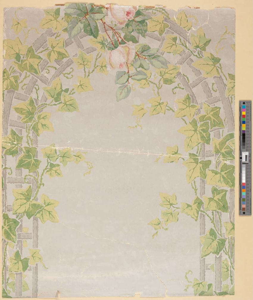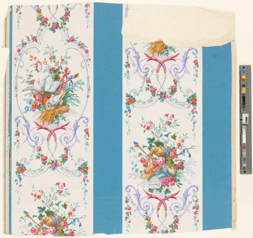 Wallpaper fragment with meandering, rustic grape vine framing a diaper patterned urn filled with a bouquet of roses, tulips, snapdragons and sweet peas. Printed in two tans, two greens, two blues, red, two pinks, and yellow on white ground.