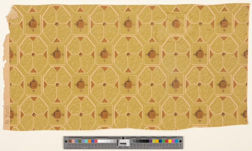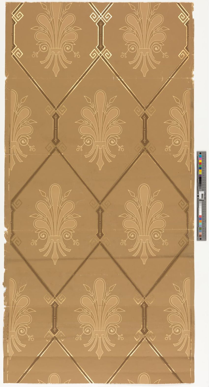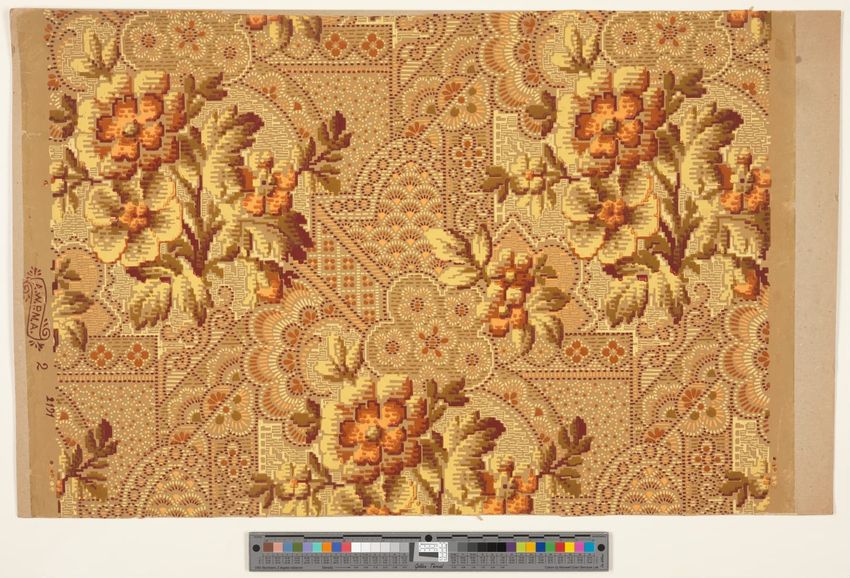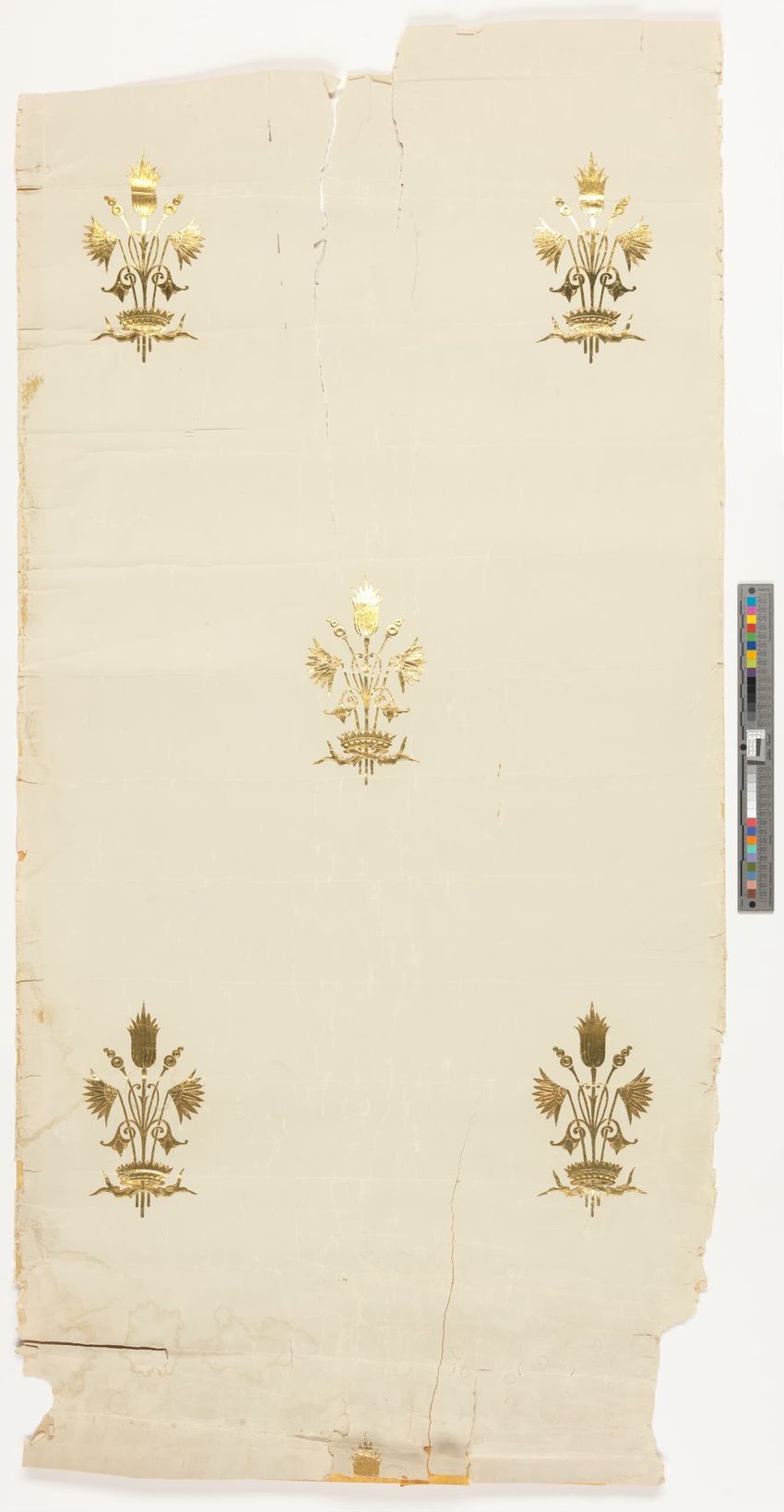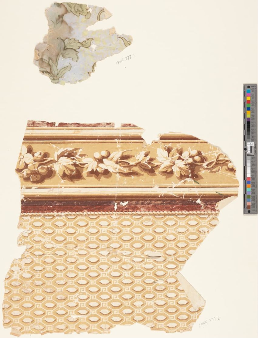 Wallpaper fragment with meandering, rustic grape vine framing a diaper patterned urn filled with a bouquet of roses, tulips, snapdragons and sweet peas. Printed in two tans, two greens, two blues, red, two pinks, and yellow on white ground.