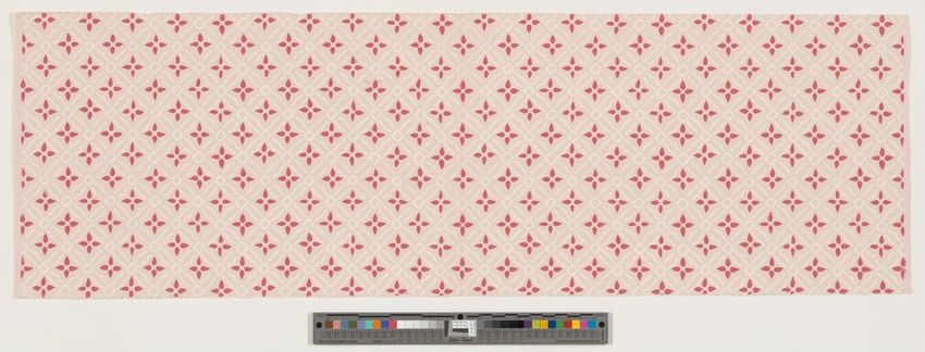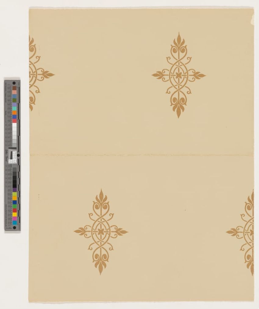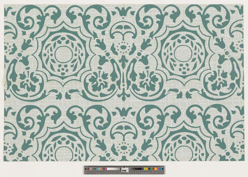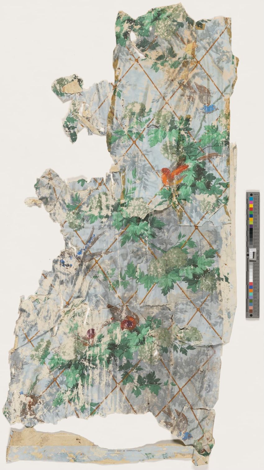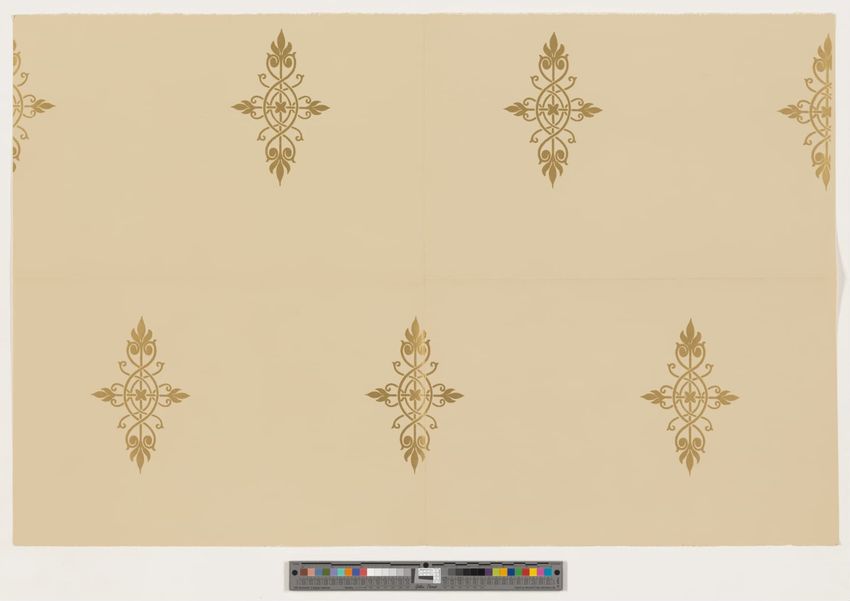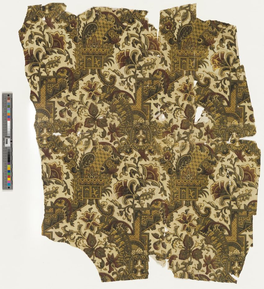 Fragment of arcade wallpaper from Barre, Vermont. Large Neo-classical column, probably part of an arcade wallpaper. Block-printed in white, three grays, pale yellow, ochre, two browns, black, blue, blue-green, and dark green on white ground.