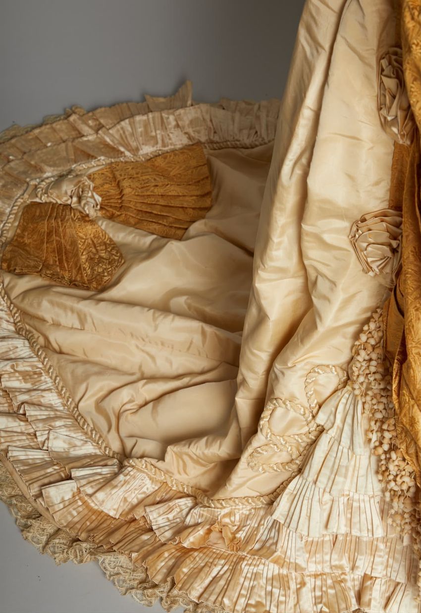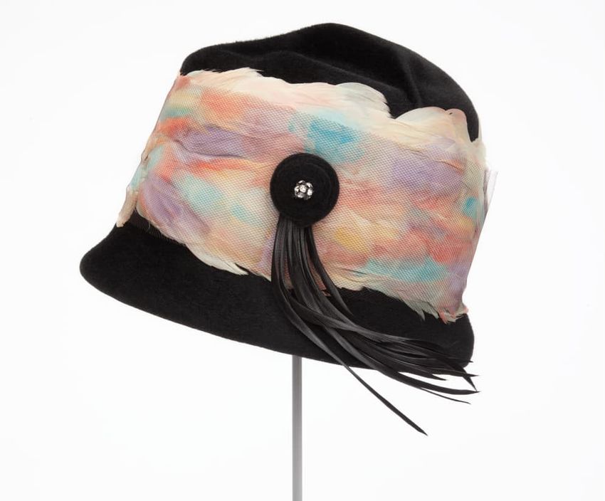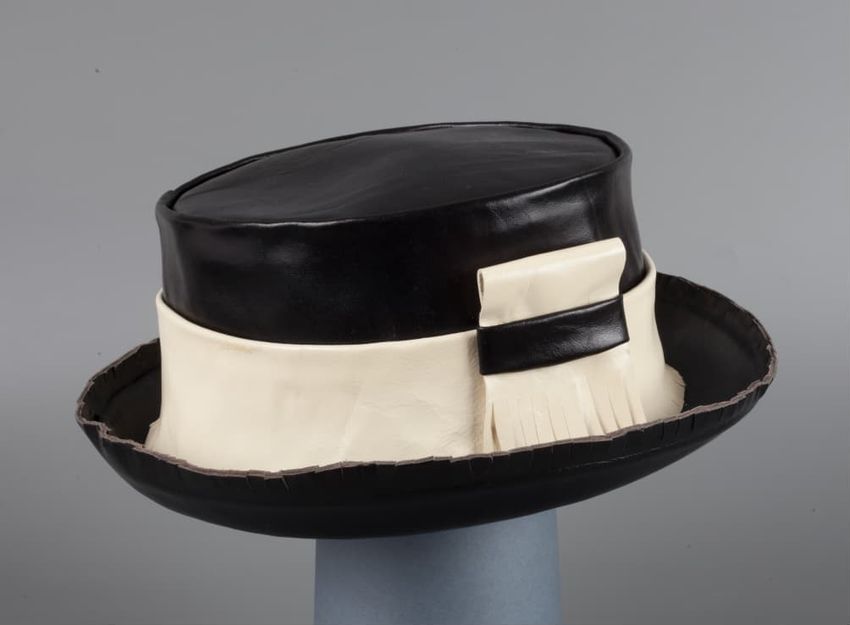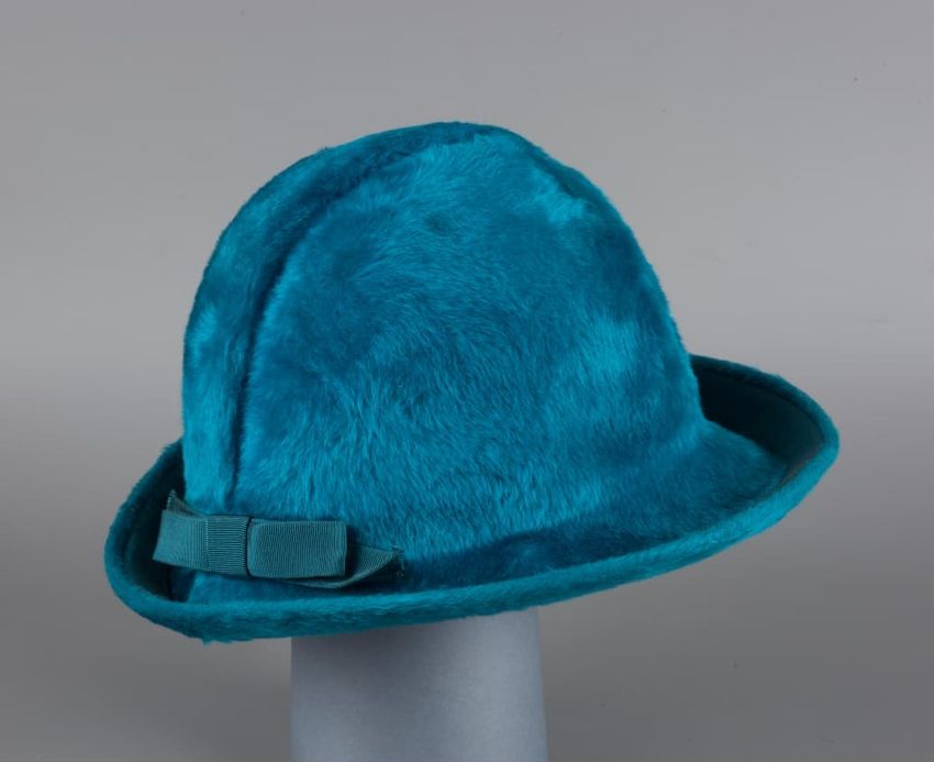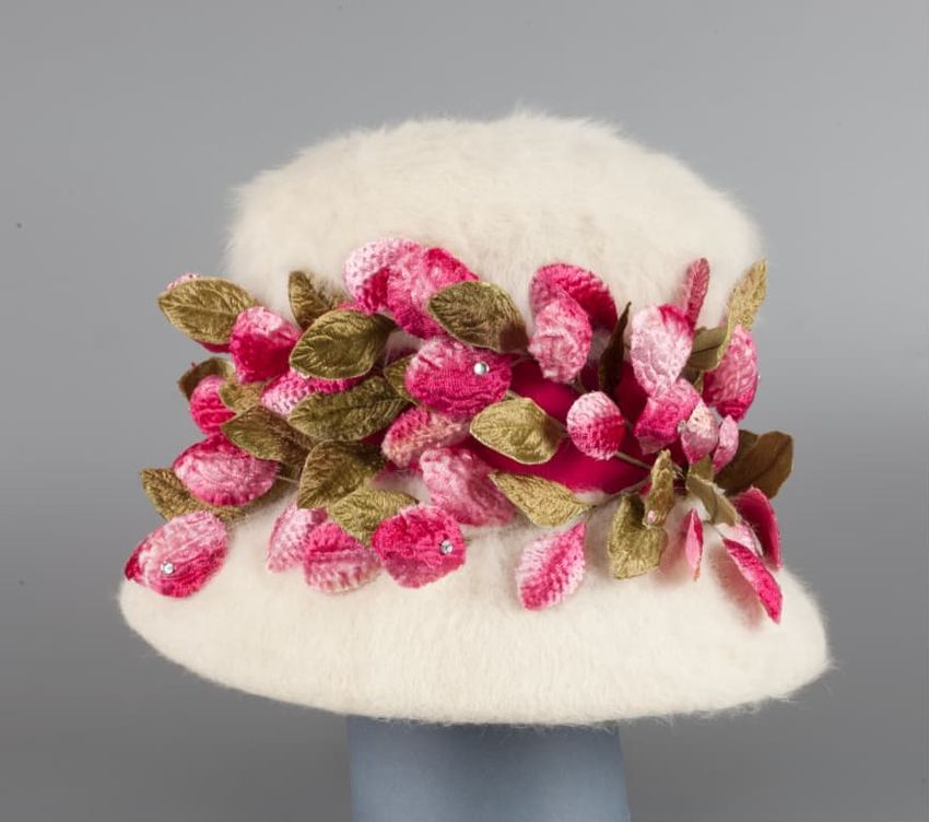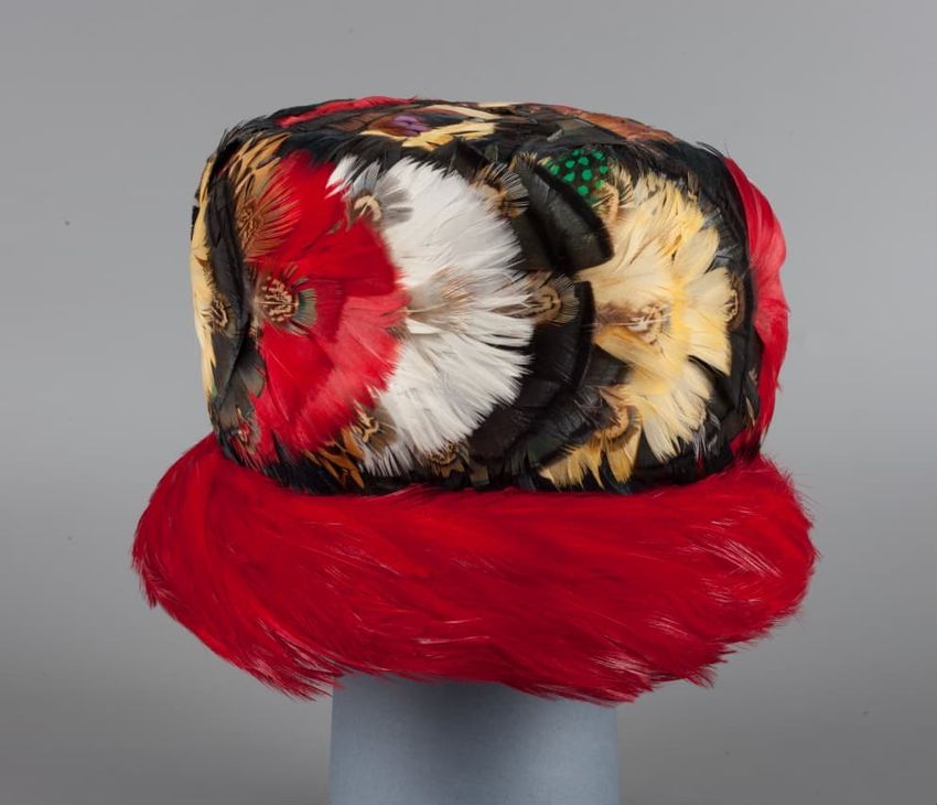 This round hat is constructed from synthetic fiber brocade. The design of the textile is repeating stripes of blue satin weave, alternating with wider stripes decorated with woven green floral vines, pink and red blossoms, and a third stripe of twined green and purple floral vines. The hat is soft, ...