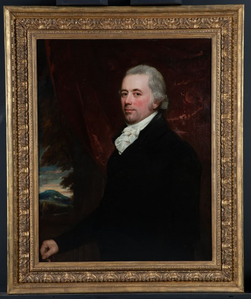 Portable desk made of mahogany with bound brass corners, attached brass handles on each side and brass plaque on top (See Inscriptions). Mahogany re-purposed from the window seats of the Hancock House, Boston, MA, which was torn down in 1863. Escutcheon lock with key.