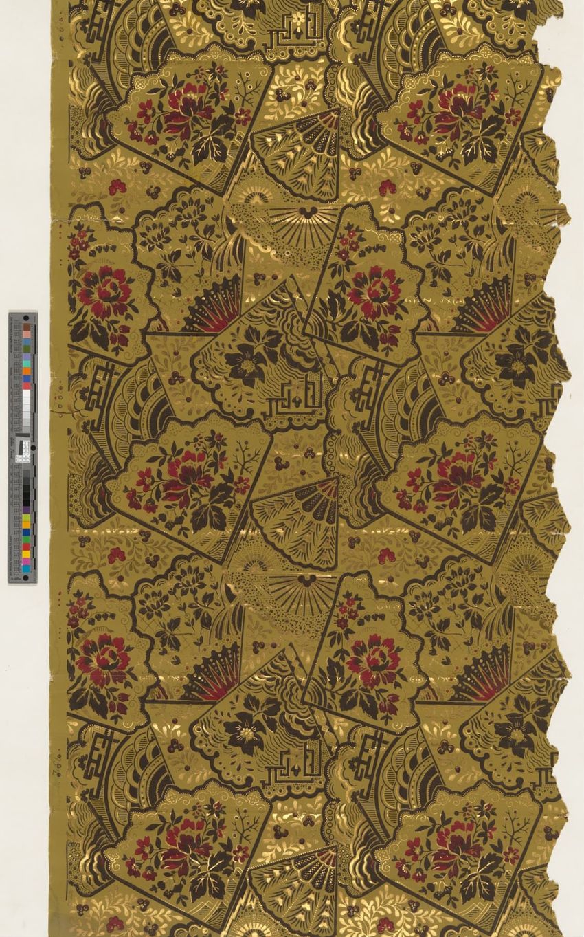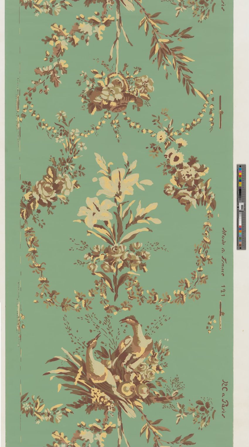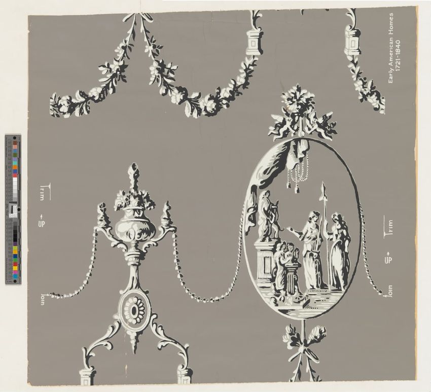 Partial roll of border wallpaper, "Pompeian Border," to be used with paper 2000.237. Pompeian scenes including female figure with schyales, Roman city wall, arched bridge, vases, and candle. Hand printed in aqua, black, orange, slate, blue, greens, and white.