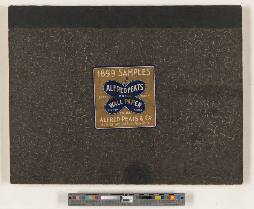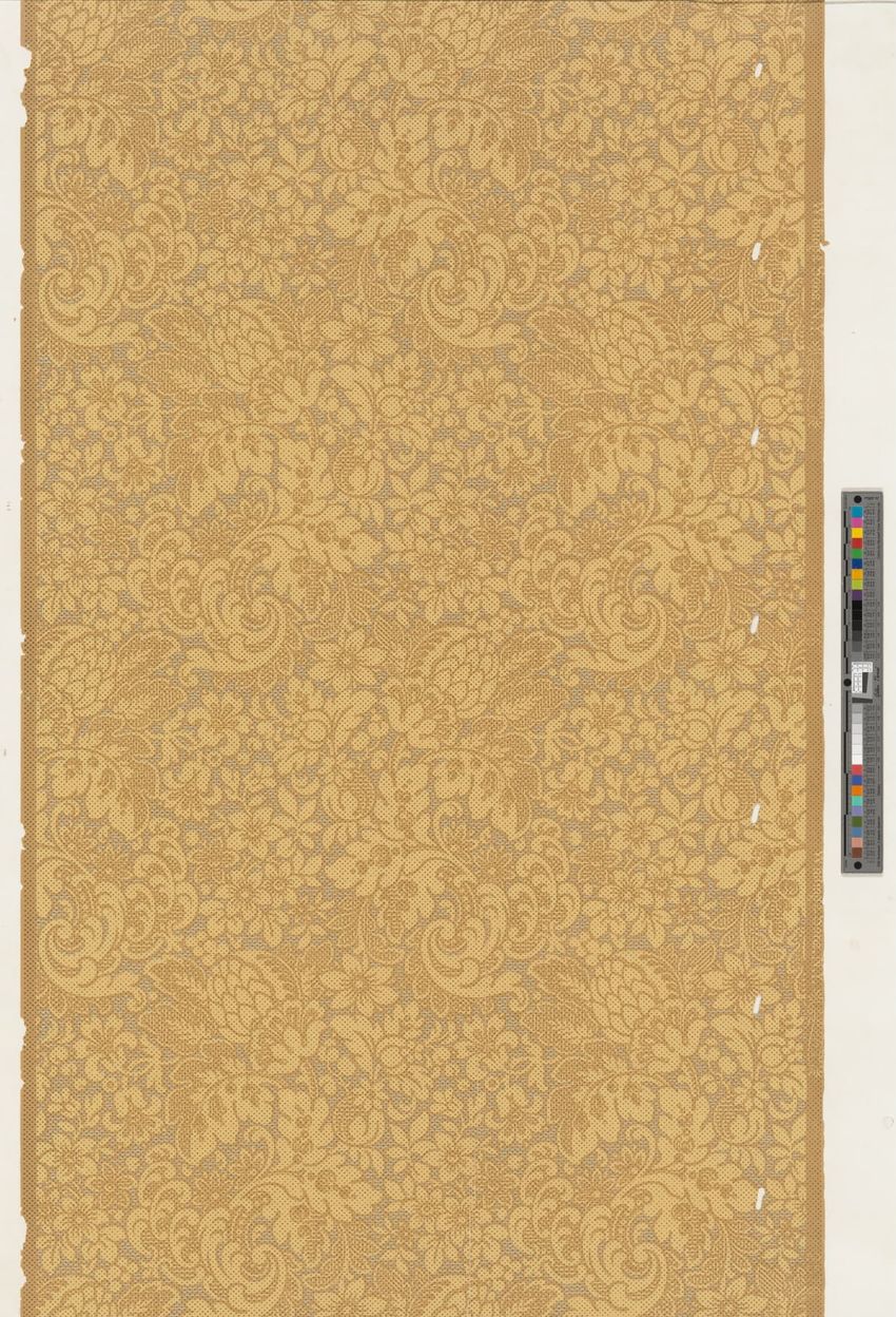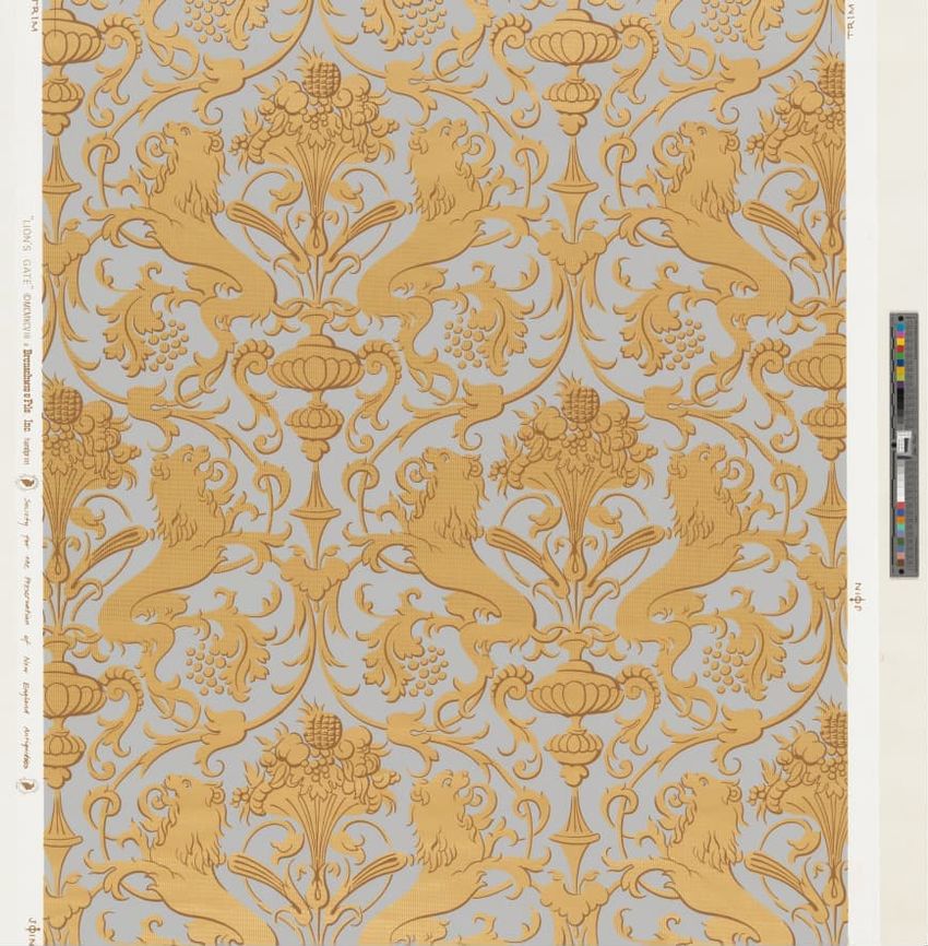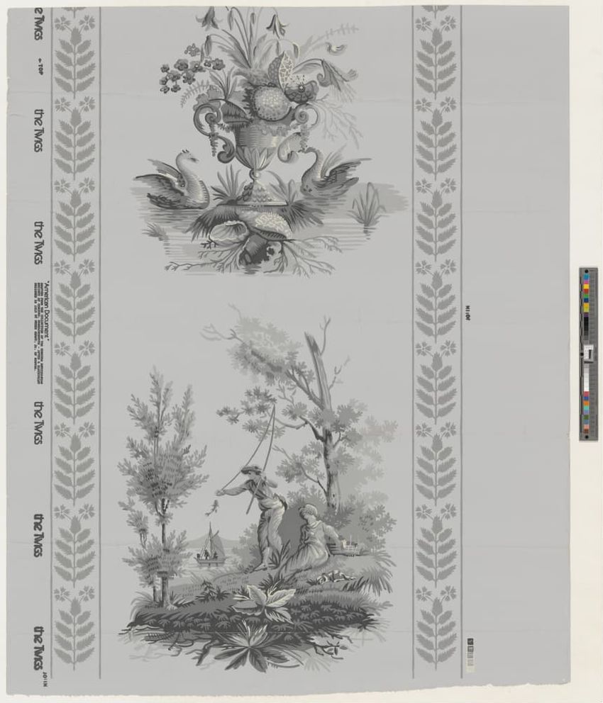 Partial roll of border wallpaper, "Pompeian Border," to be used with paper 2000.237. Pompeian scenes including female figure with schyales, Roman city wall, arched bridge, vases, and candle. Hand printed in aqua, black, orange, slate, blue, greens, and white.