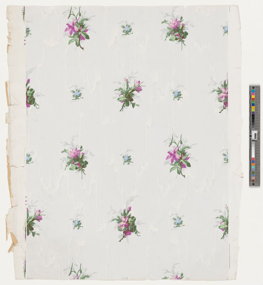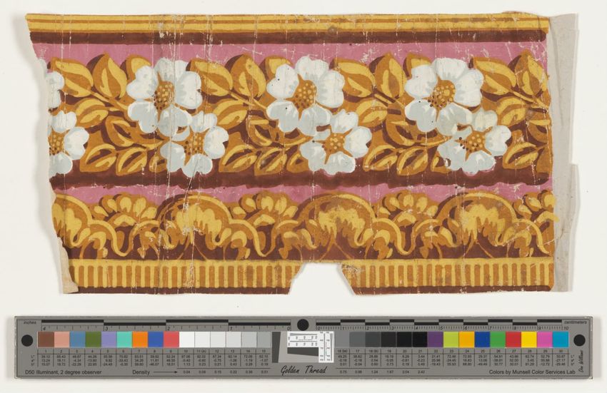 Two matching fragments of unused floral wallpaper border. Purple, white, orange, pink and blue flowers on green, leafy stem. Block-printed in brown, four greens, white, two grays, dark red, two oranges, two purples, pink, mauve, maroon and three blues on white ground.