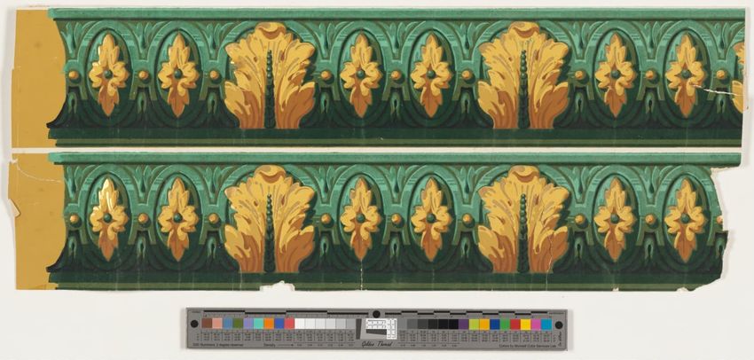 Birch bark wastebasket scraped or etched with design of stylized ferns, feather, trees, circles, hunter with feathered headdress and bow and arrow, and moose or elk. Attributed to Tomah Joseph by donor but may be the work of fellow Passamaquoddy birch bark artist John Snow based on similar examples ...