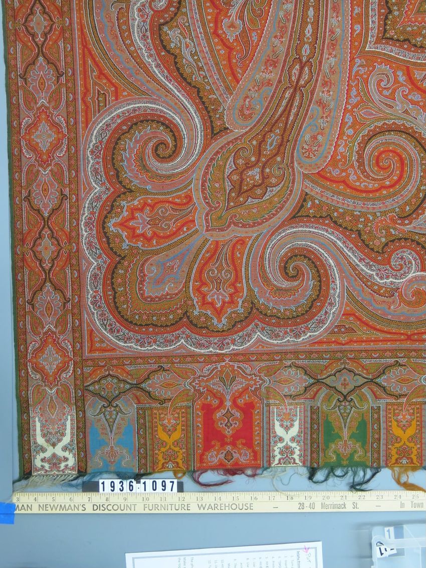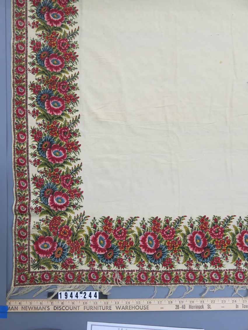 Cream ground with 4 3/4" border with blue edge and paisley motif in green, red, blue, yellow and motifs in opposing corner; wool weft, wool warp with silk stripes; tied on wool fringe.