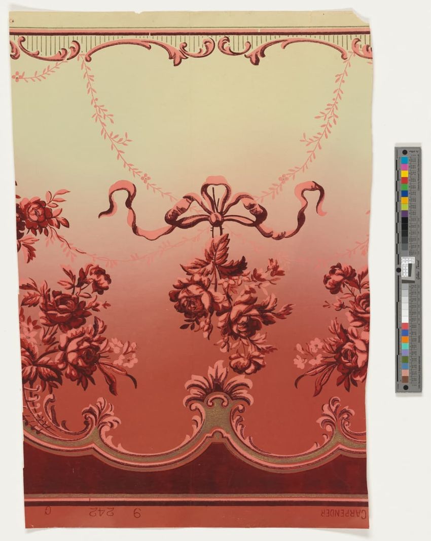 Two matching fragments of unused floral wallpaper border. Purple, white, orange, pink and blue flowers on green, leafy stem. Block-printed in brown, four greens, white, two grays, dark red, two oranges, two purples, pink, mauve, maroon and three blues on white ground.