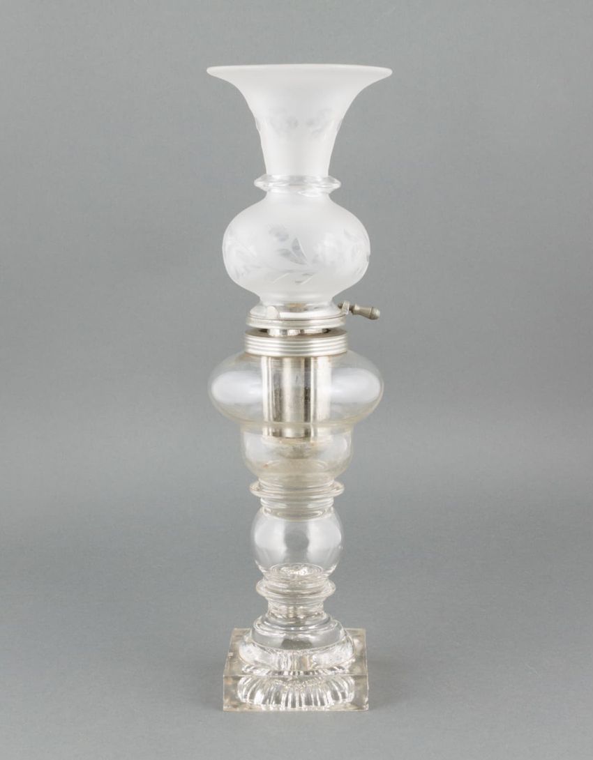 Colorless glass whale oil lamp with blown glass font, molded foot, and frosted Liverpool cut glass shade.