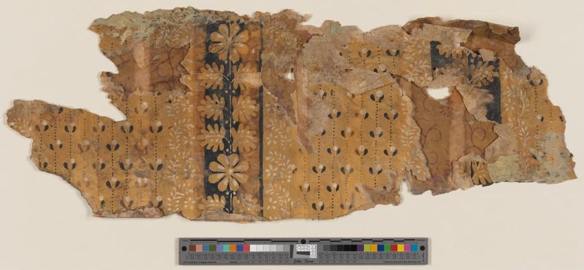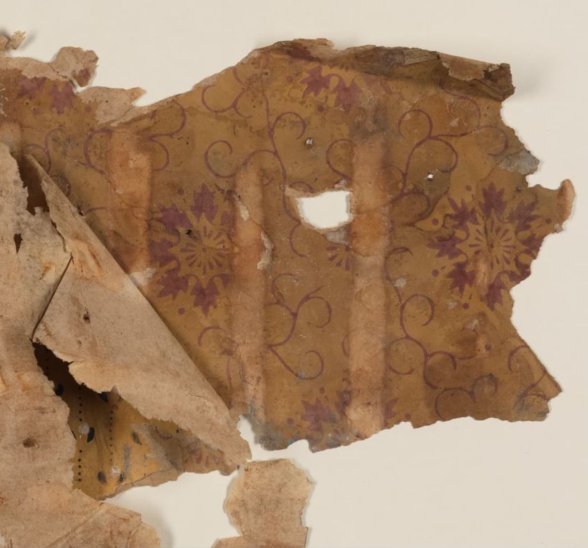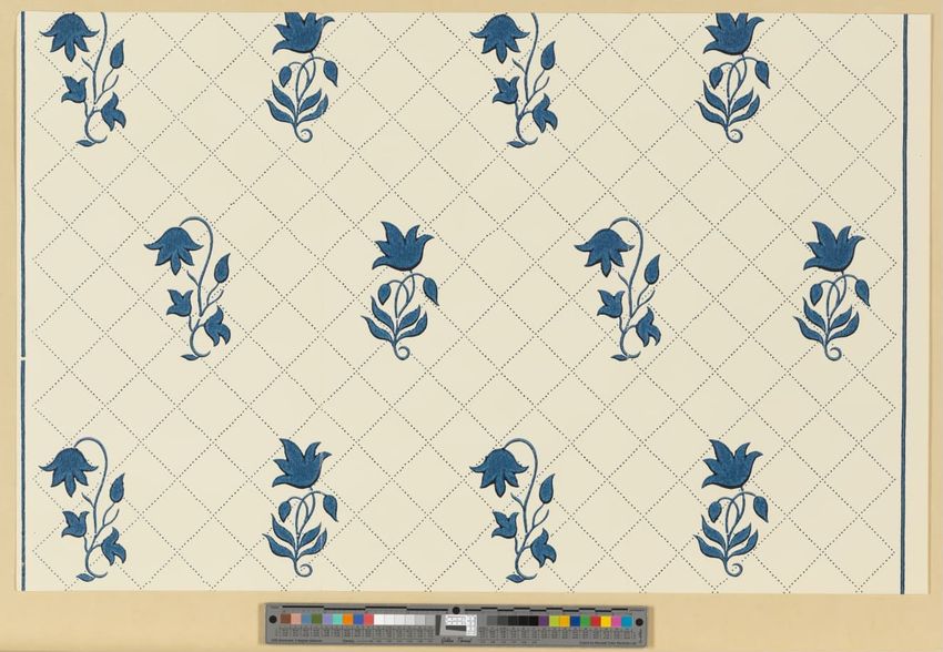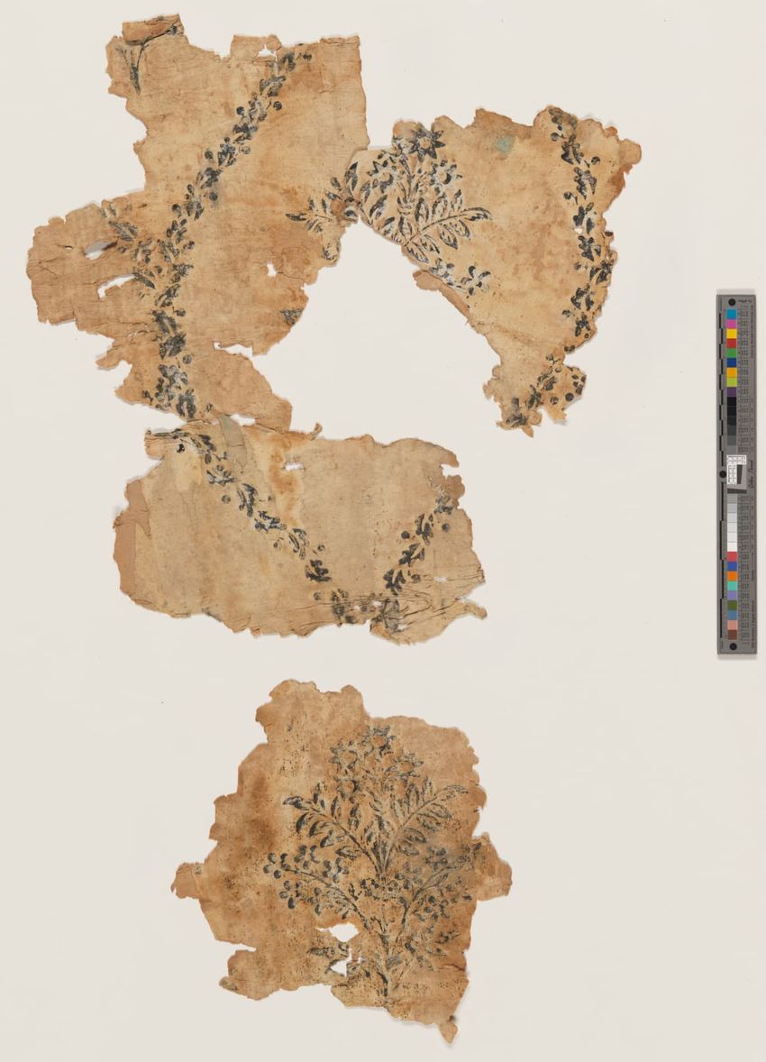 Wallpaper fragments from the Captain John Kendrick House, Wareham, Massachusetts. Second layer of paper from north room on second floor, removed during mid-1970s restoration. All-over floral pattern block-printed in yellow and blue-gray on blue ground. Wove paper, partial sheets.