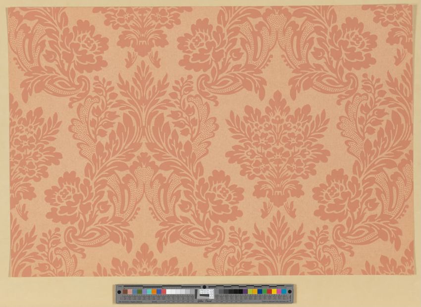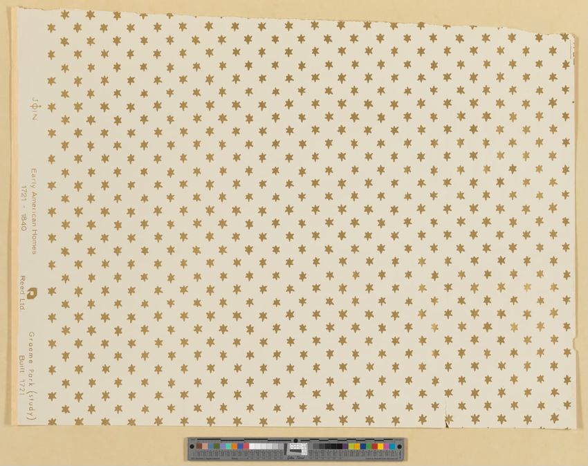 Wallpaper fragment from Wareham, Massachusetts. All-over medallion pattern. Small medallions with stylized floral centers among curling figures and small stylized flowers. Block-printed in red on ochre ground. Wove paper, partial sheets. Fragment is the second layer of three and is still adhered to ...