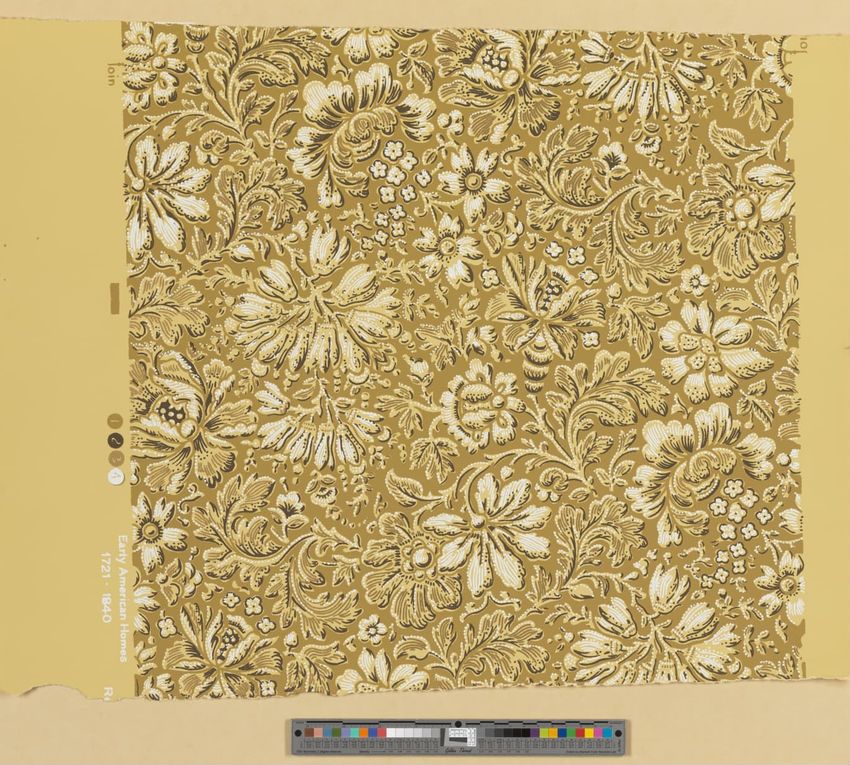Unused sample. Wall paper in the "Washington's Headquarters" pattern by Reed, Ltd. All-over design of stylized flowers and scrolling foliage. Screen printed in olive green, brown, metallic gold and white on ochre ground.