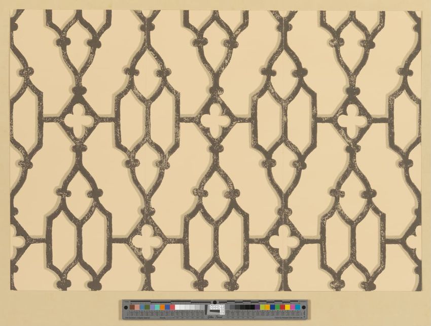 Unused sample. Wallpaper with all-over design of Gothic tracery and quatrefoils. Machine printed in two greys on a tan ground. Produced by Clarence House (NY).