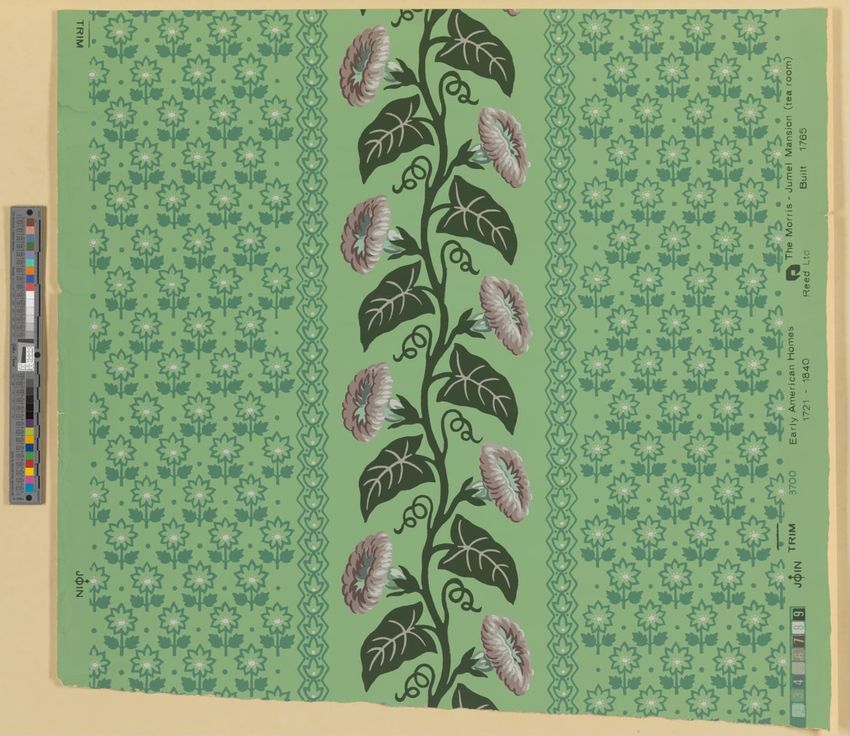 Unused sample. Wallpaper border in "The Morris-Jumel Mansion" (Tea Room) pattern. Two attached borders of morning glories and iby leaves framed by beading. In one border the flowers are separating birds drinking from a fountain. In the second, the flowers alternate with an urn flanked by birds with ...