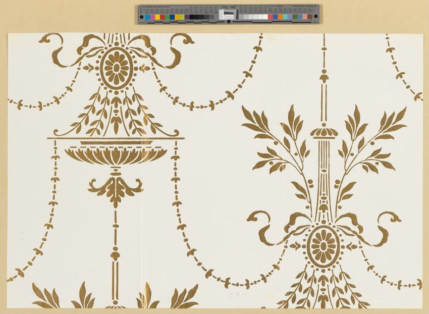 Sample. Wallpaper border printed with stylized Greek revival motifs.Printed in gray, white orange, brown, green, crimson and metallic gold on a crimson ground. Mounted on cardboard on top of two earlier papers.