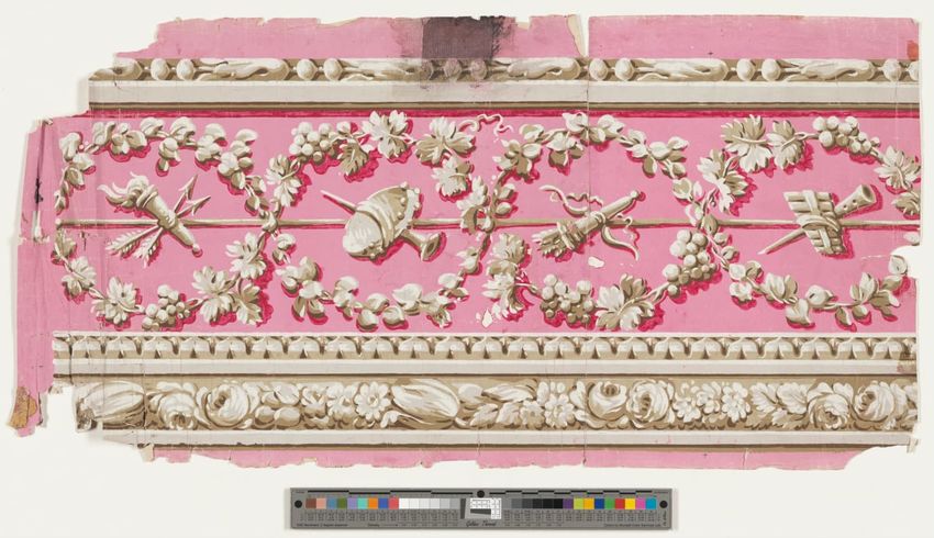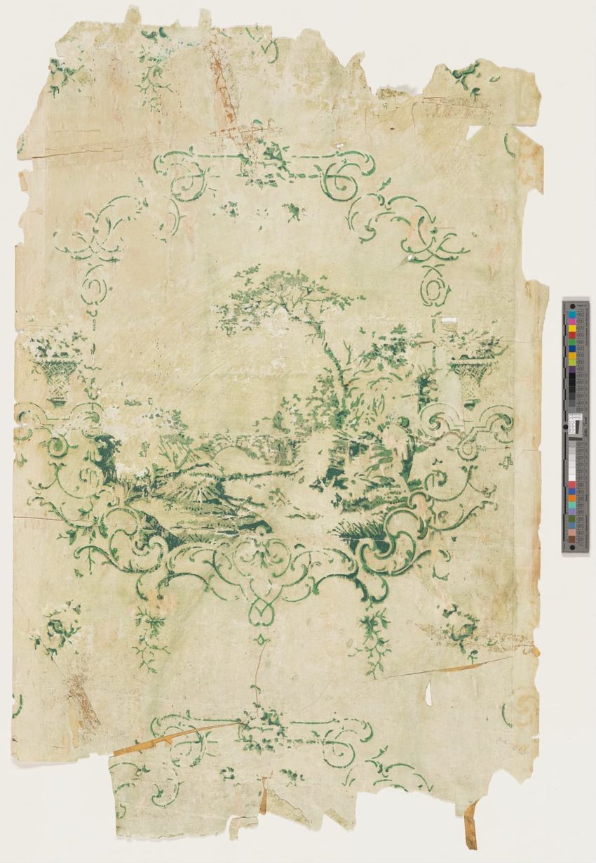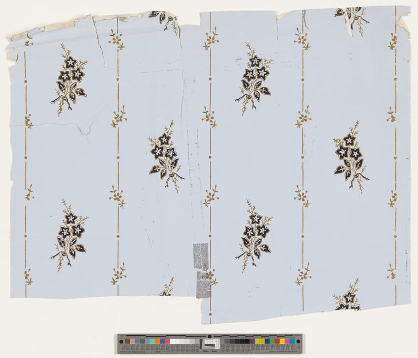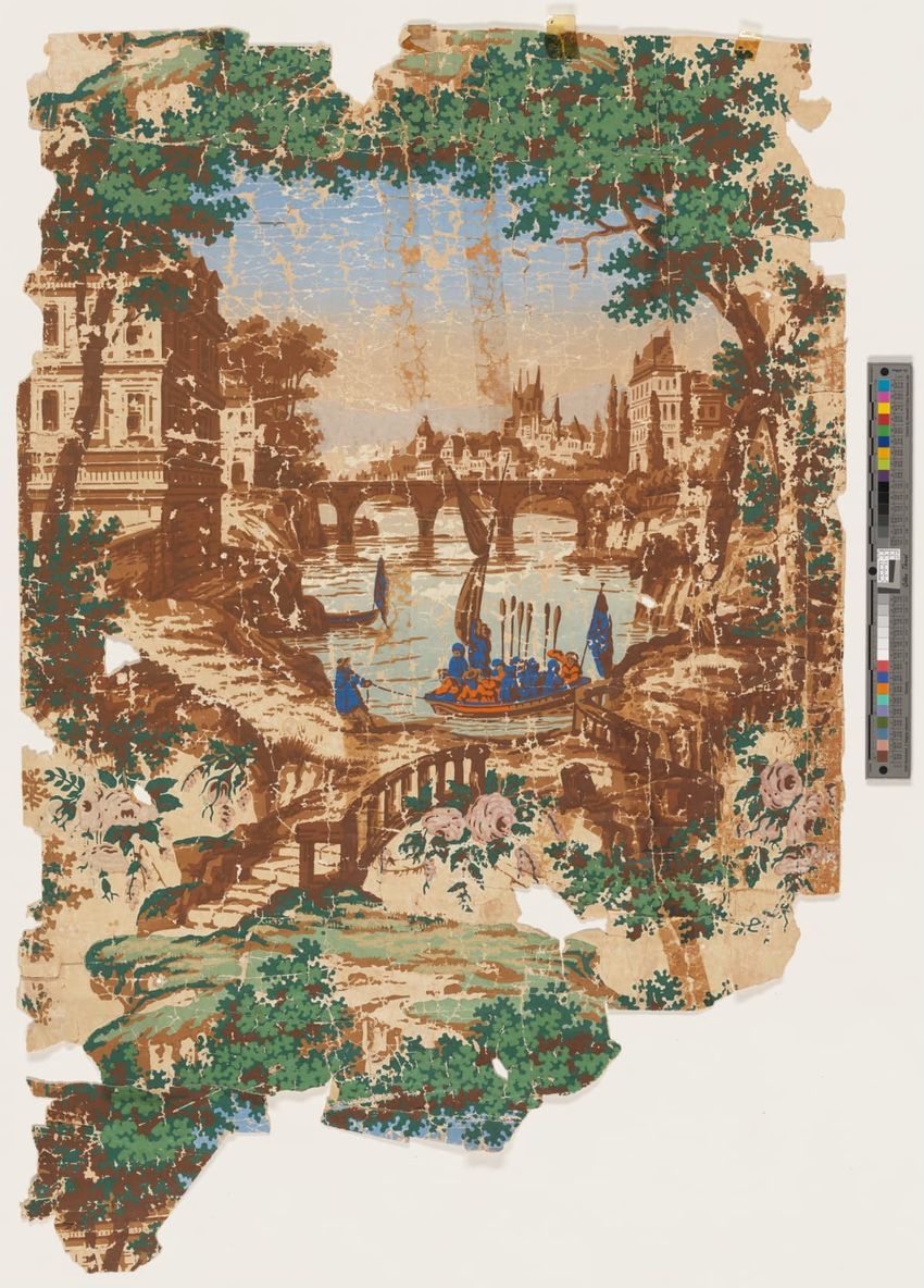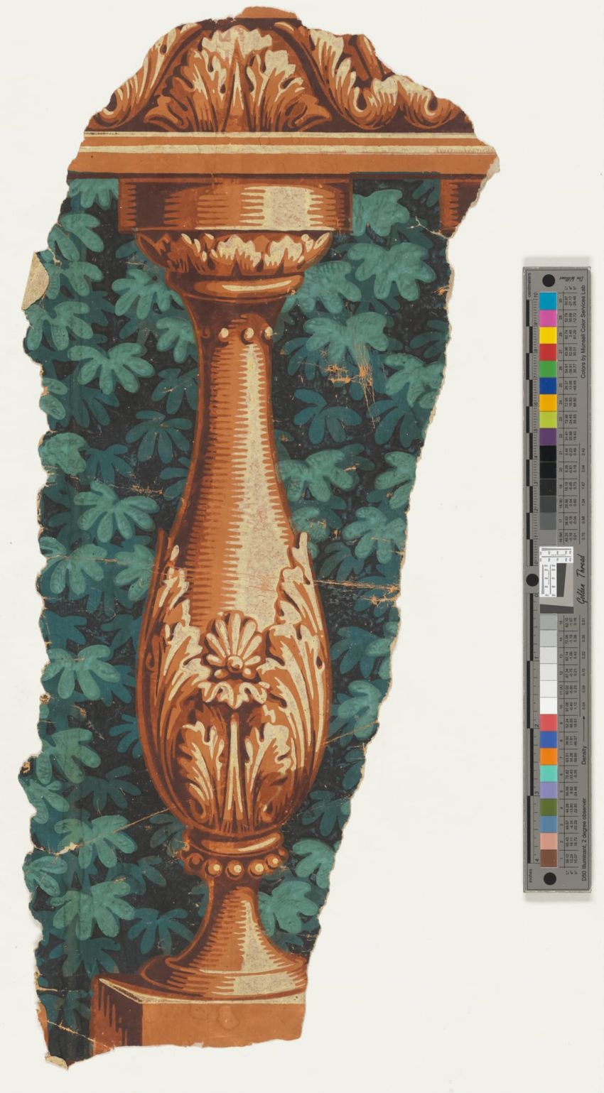 Fragment of arcade wallpaper from Barre, Vermont. Large Neo-classical column, probably part of an arcade wallpaper. Block-printed in white, three grays, pale yellow, ochre, two browns, black, blue, blue-green, and dark green on white ground.