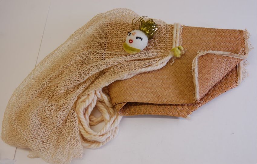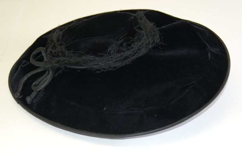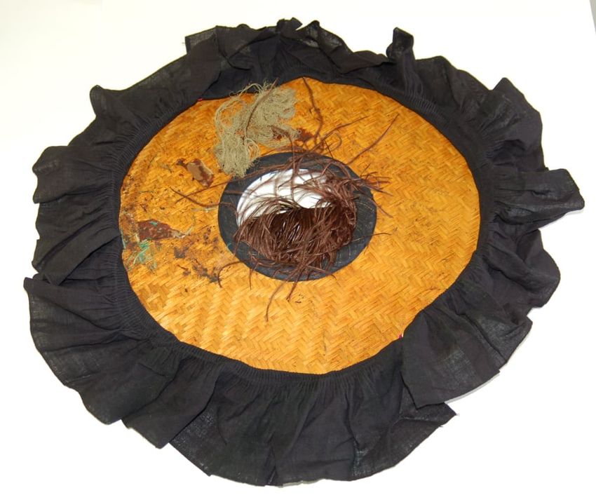 Costume hat with broad woven circular bamboo brim. Circular cut-out at center of brim, edged in black cotton. A large feather on top of the hat. Black cotton fabric stitched around the perimeter of the brim, which hangs down. Pieces of purple net, green net, green feathers, and black net are adhered...