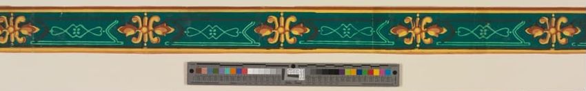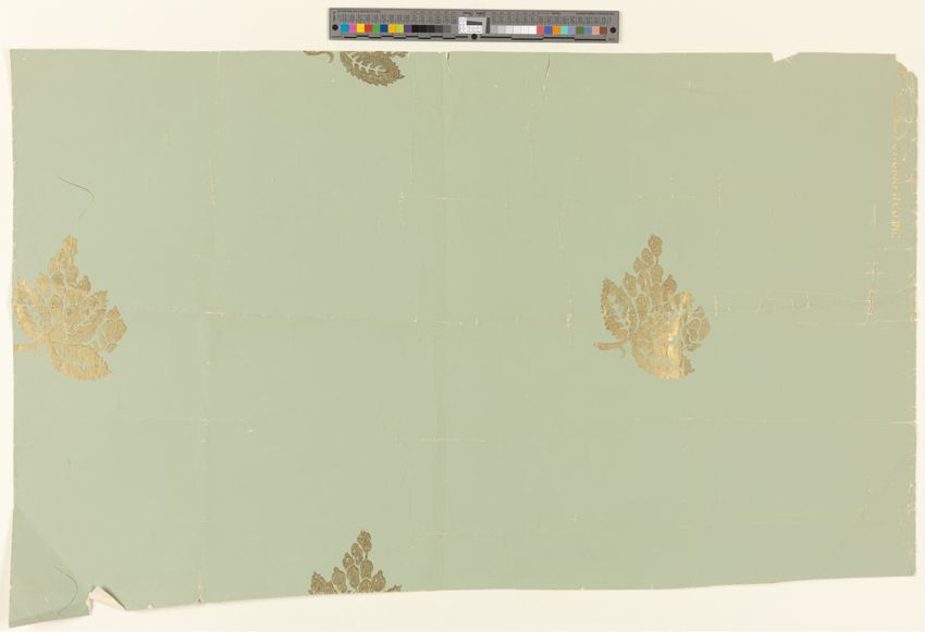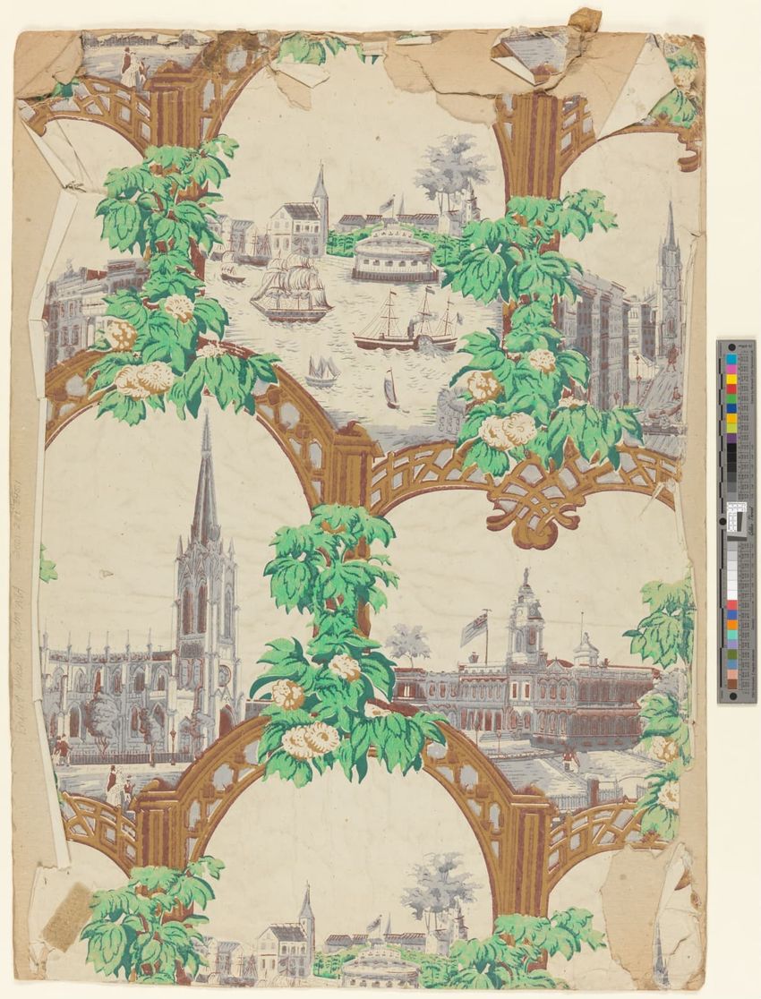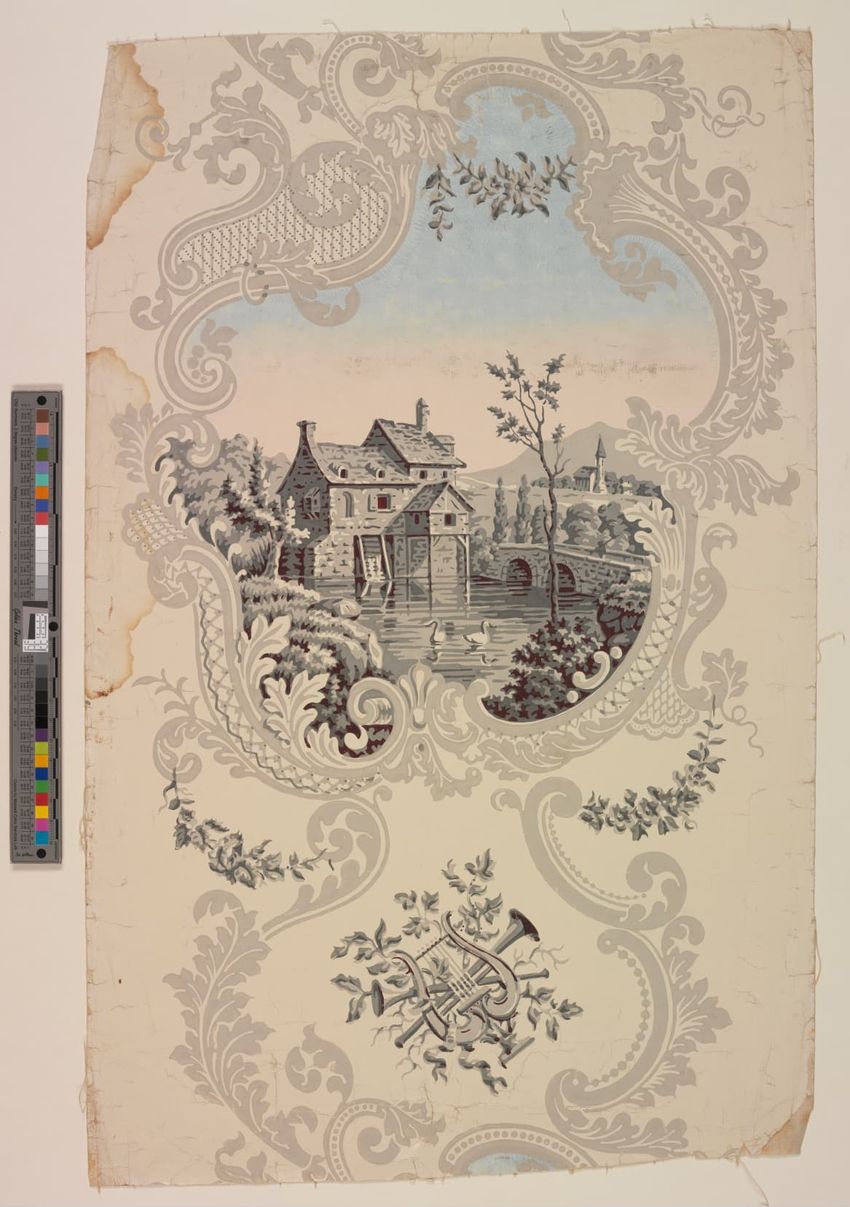 Unused nursery wallpaper from Grafton, Massachusetts. Scenes depicting proverbs, such as "don't cry over spilled milk" are framed by vines and flowering plants such as grapes and morning glory. Roller-printed in olive, green, pink, blue, gray, peach, ochre and black on white ground.