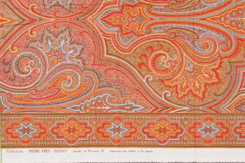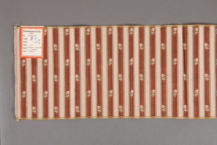 This is a glazed overall piece with two attached paper labels representing hydrangeas, roses, daisies and other kinds of flowers, grouped to form a sort of column. We can see one entirely, and part of the ones on its sides. The background is taupe.