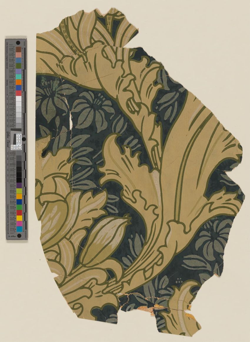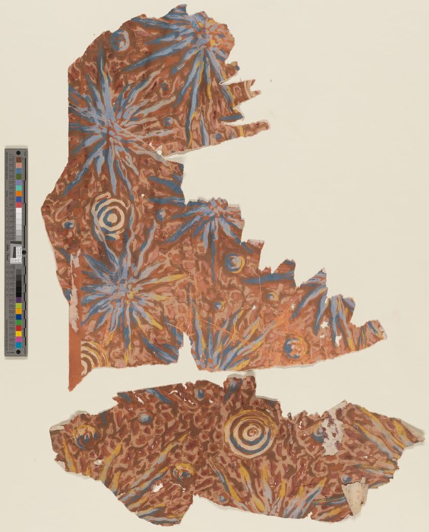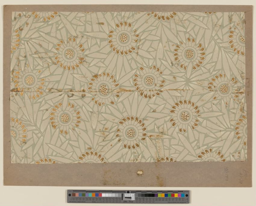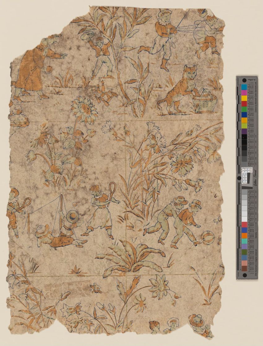 Wallpaper border fragment from Falmouth, Massachusetts. Oakleaf and daisy border. Block-printed in red, three greens, two olive greens, two purples, mauve, two grays, four browns, dark blue, tan and ochre.